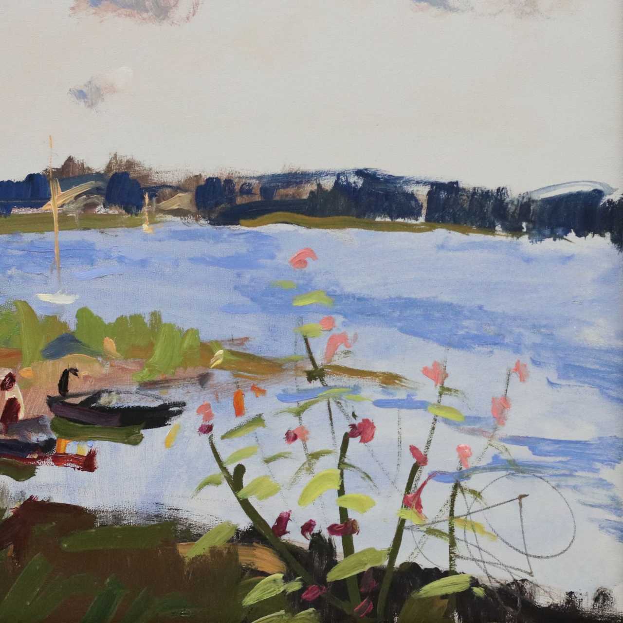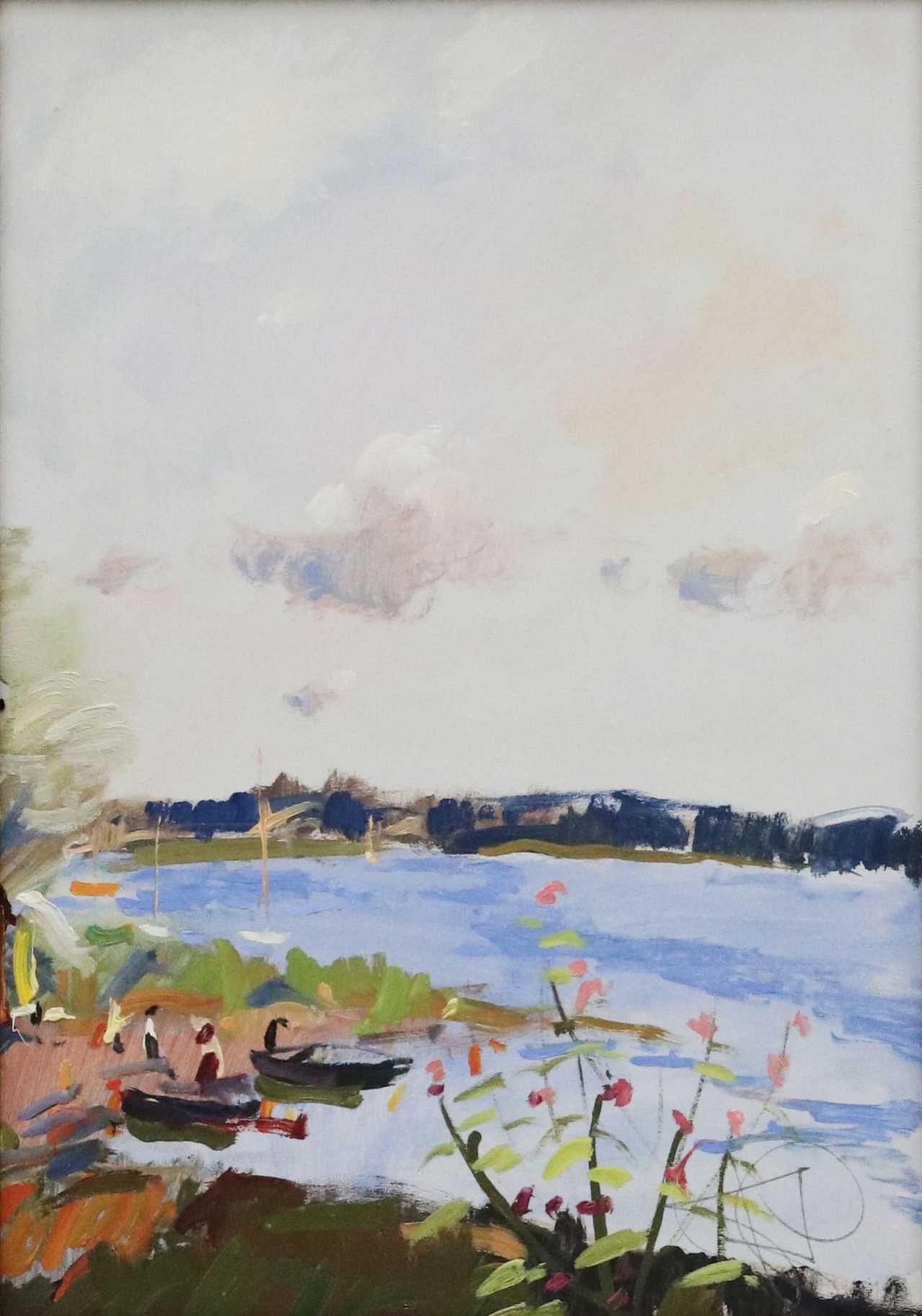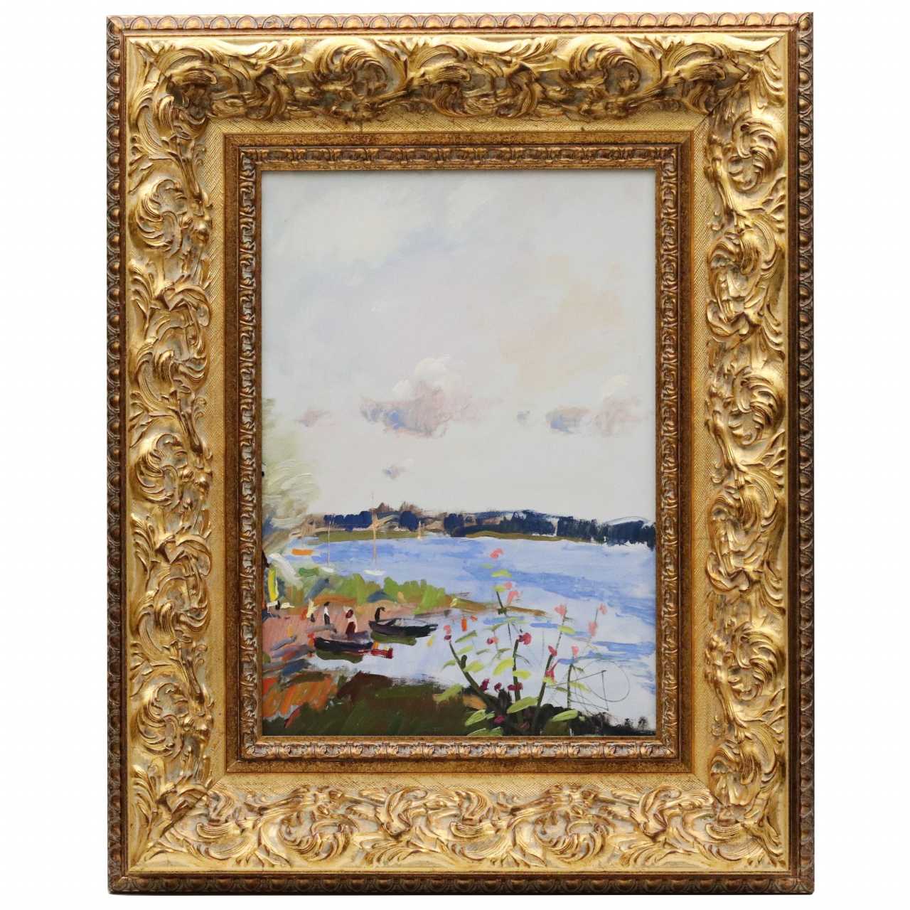 Janis Pauluks. Lielupe. 1953 Lune des premières œuvres captivantes et légères du grand expressionniste letton de la seconde moitié du XXe siècle. Représente une vue du méandre de la rivière Lielupe avec des bateaux et des buissons au premier plan, une bande contrastée de la rive opposée et un ciel baltique dune hauteur perçante et presque incolore. Lharmonie subtile des couleurs pastel crée le génie du lieu et du temps - la constance instable de la chaleur de lété, du ciel et de la vie en dessous. La constance changeante de lêtre. Carton, huile. 50x35 cm Signature de lauteur en bas à droite. Le certificat de la galerie ART-FLAT est joint.