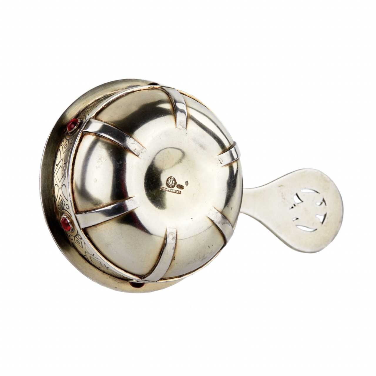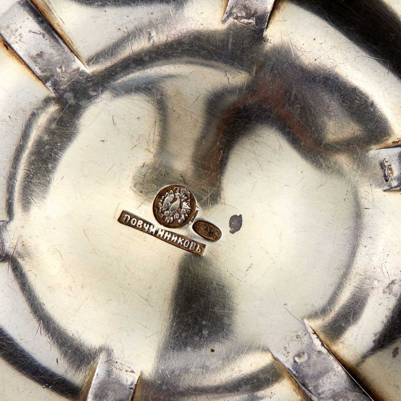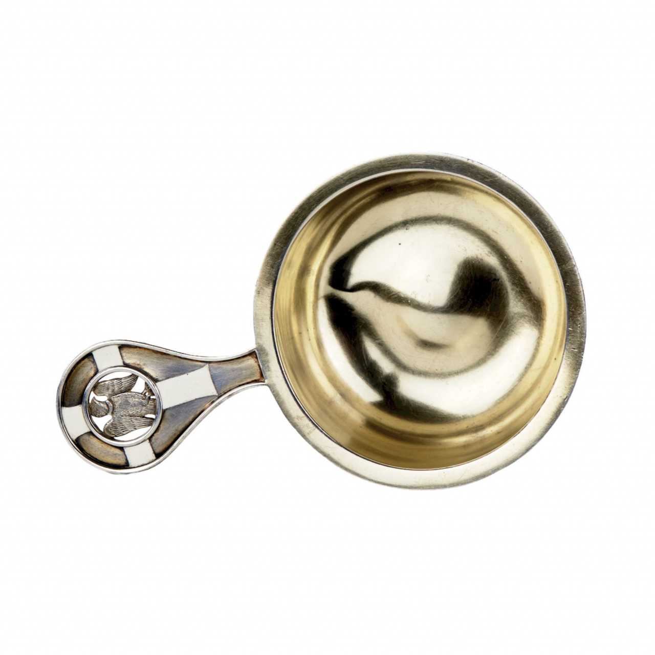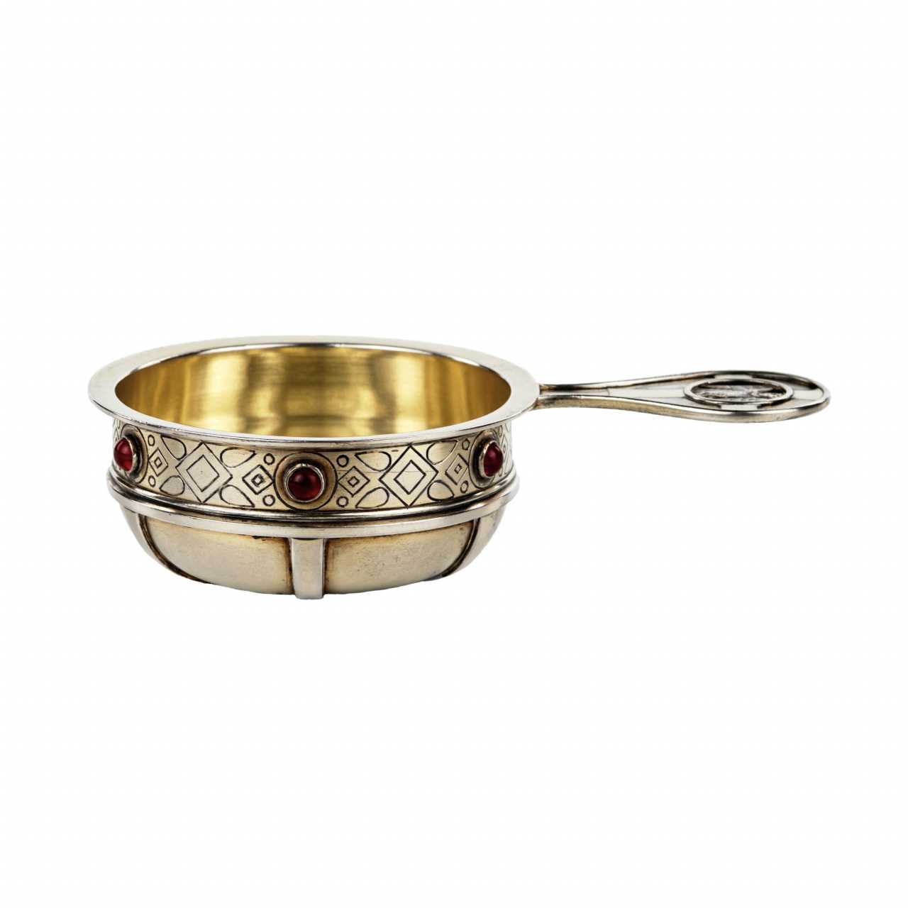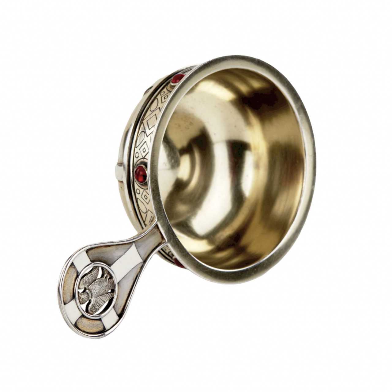 Kovsh en argent de Pavel Ovchinnikov avec emaux. Fabrique sous la forme d`un bol liturgique sous l`influence du style greco-romain. Le vase rond plat à anse horizontale est muni de nervures de rigidification et est decore le long du corps d`une ceinture à motif geometrique avec un cabochon en verre rubis. Le manche est orne d`une croix en email avec un faucon à l`interieur. Marque pleine de P. Ovchinnikov sous l`aigle bicephale. Moscou 84 echantillon d`argent 1899-1908. Maître d`essai Ivan Lebedkin. Longueur 14,5 cm Poids : 145 grammes.