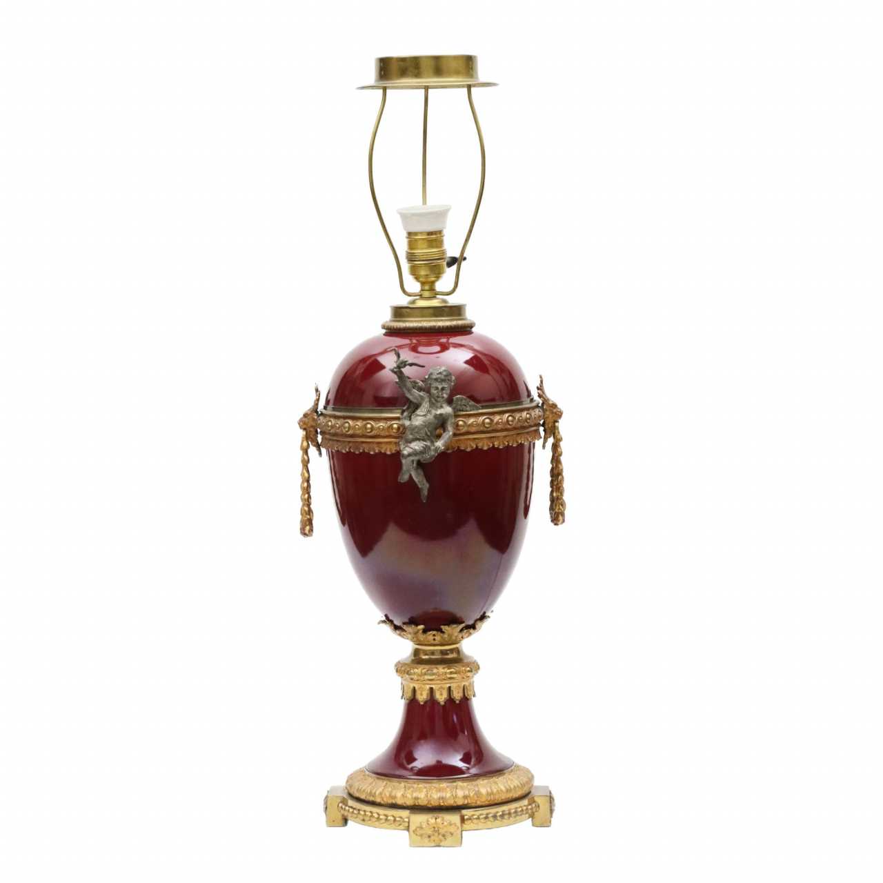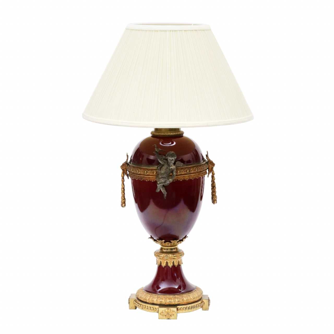 Lampe de table en porcelaine, richement decoree d`elements decoratifs en bronze dore : une figurine d`ange, des mascarons en forme de têtes de lions, des guirlandes de fleurs. electrifie.