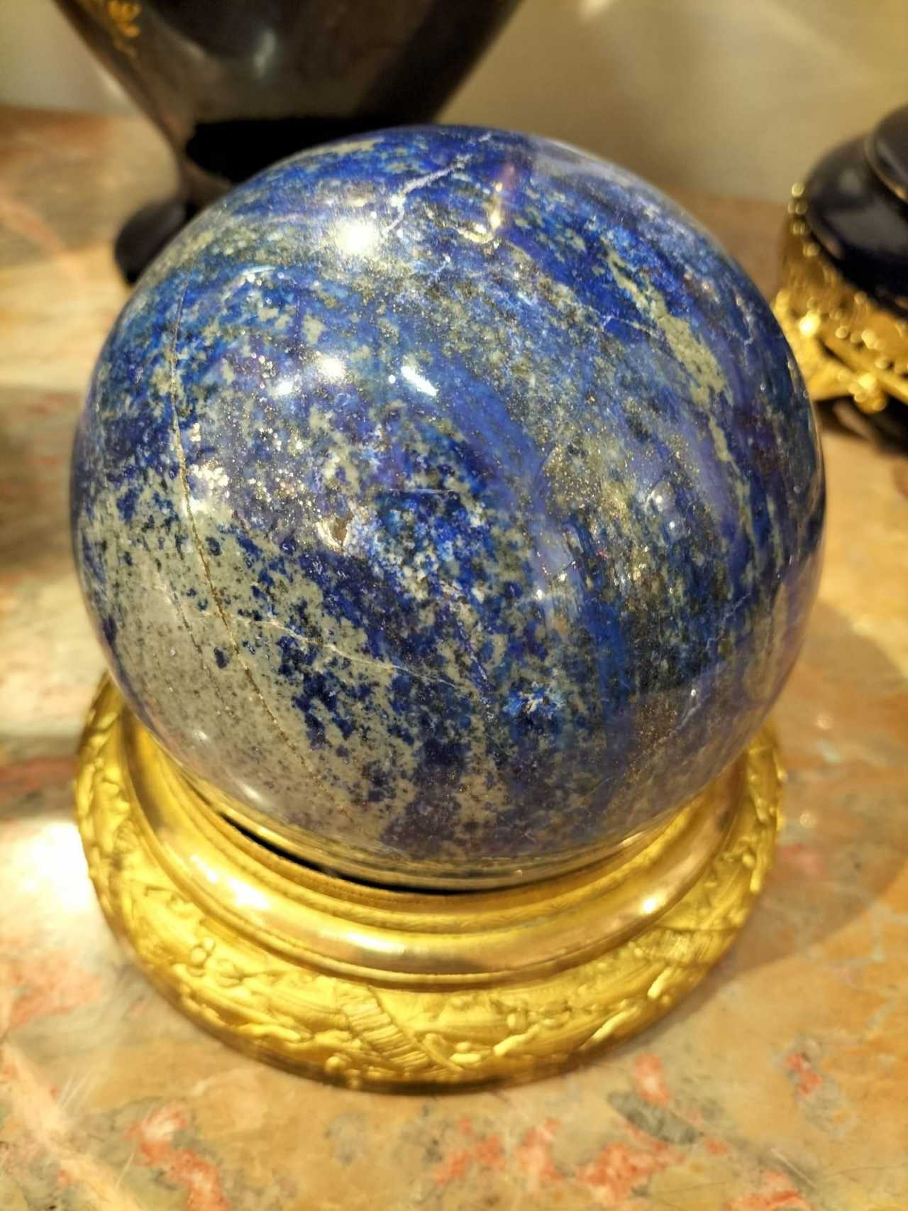 We are delighted to present you with this incredible polished sphere of Lapis Lazuli, a deep blue metamorphic rock often used in jewelry and decoration.The sphere displays a vibrant mix of blue hues, interspersed with veins of white calcite and specks of golden pyrite, which are characteristic of high-quality Lapis Lazuli.The stone is mounted on a 19th century bronze gilded base.The natural beauty and unique patterning of this stone makes it a striking decorative piece that would enhance any living space.