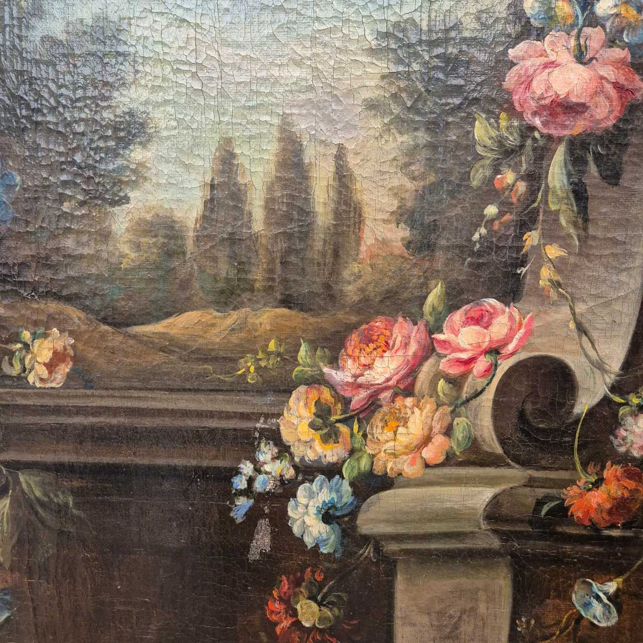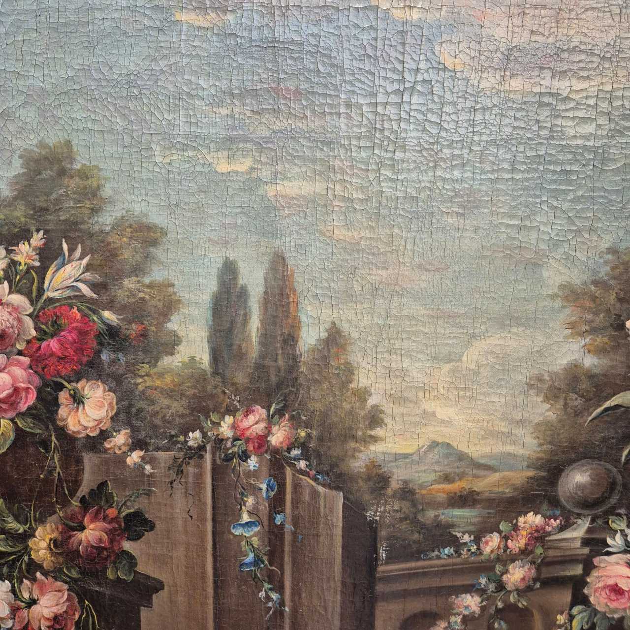 This monumental architectural painting depicts a stone fountain topped by a large bronze basin, from which an impressive floral arrangement unfurls. The ground is strewn with grapes, peaches and a pumpkin, symbolizing fertility and abundance.In the background, a décor of ancient ruins unfolds, with classical architectural elements lending an enigmatic atmosphere to this work.Finally, in the last shot, a wooded landscape with cypress trees reminiscent of Tuscany and a mountain in the distance. Above this luxuriant scene, a blue sky dotted with clouds ranging from grey to golden unfolds and illuminates the entire scene.Stylistically, this painting is in line with certain Italian still lifes of the late 17th and early 18th centuries. It probably comes from the workshop of an Italian master who understood the appeal of Dutch and Flemish works such as those by the artist Gaspar Pieter Verbruggen Le Jeune (1664-1730). One of these masters was Orsola Maddalena Caccia (1596-1676), considered a pioneer of still-life painting in Italy.In its pictorial style and choice of subject, the painting is also reminiscent of the works of Neapolitan painter Gasparo Lopez dei Fiori, who distinguished himself by his often redundant compositions of flowers, most often placed outdoors, in elaborate contexts rich in naturalistic and architectural elements.This majestic painting comes from the private collection of a renowned family, and was displayed in one of the familys villas in Cannes on the Côte dAzur in France.The painting is presented in a 19th-century gilded wooden frame, a fitting piece to adorn large walls: a classic, elegant setting that we never tire of admiring.Dimensions of unframed canvas :Height : 123 cmWidth : 187 cm