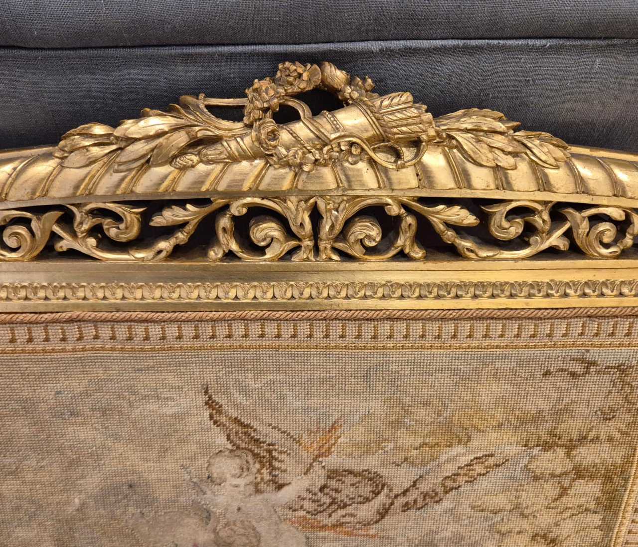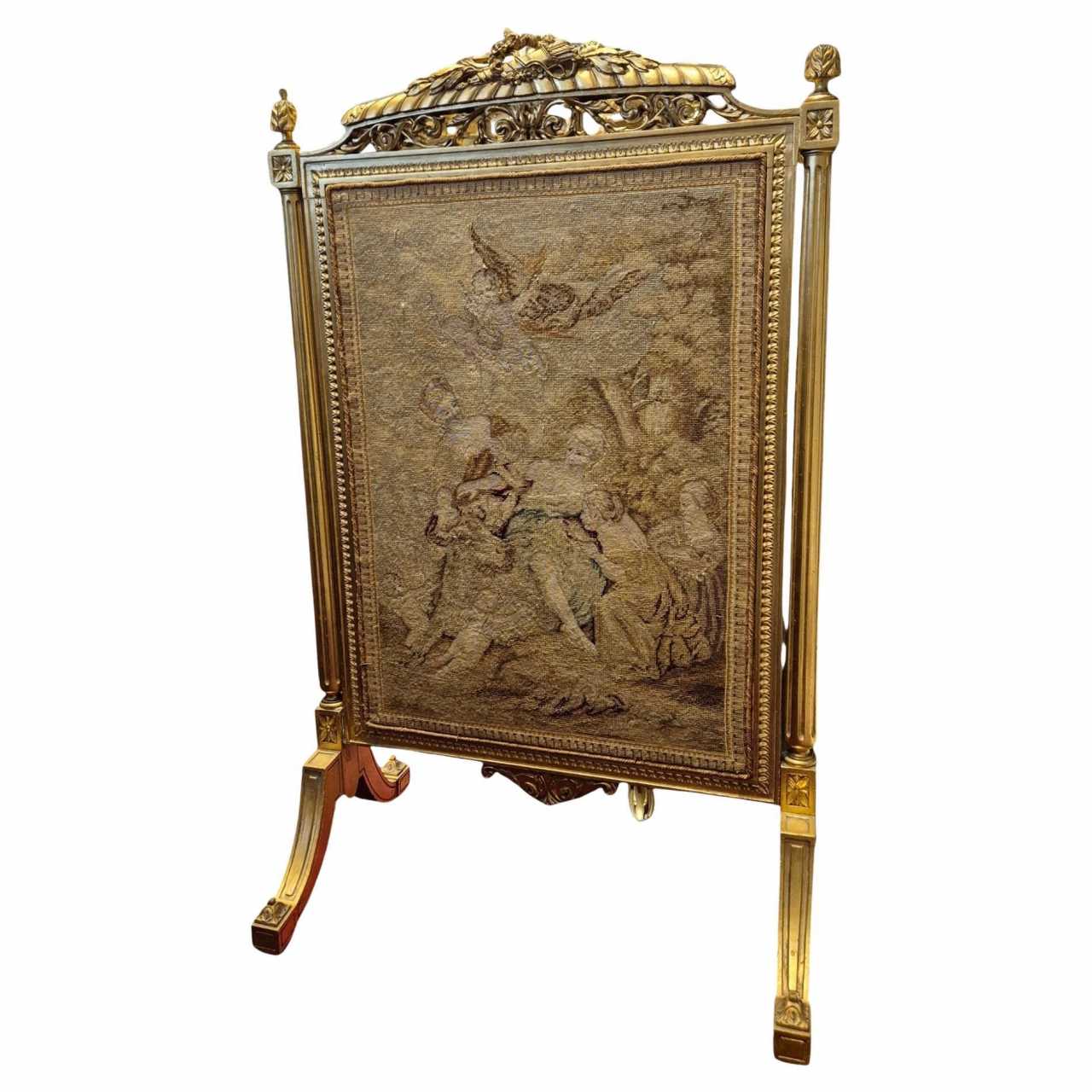 Louis XV style gilded wood fire screen, 19th centuryCarved gilded wood fire screen decorated with a tapestry with original stitches representing the abduction of Europa.The surround is made up of detached columns topped with rosettes and pompoms.The frame is decorated with pearl rays with a cornice topped with a frieze of openwork acanthus leaves on which rests a quiver, a bow and a crown of flowers. It rests on four arched scrolled legs.This beautifully crafted piece of furniture is distinguished by its elegance and decorative character.