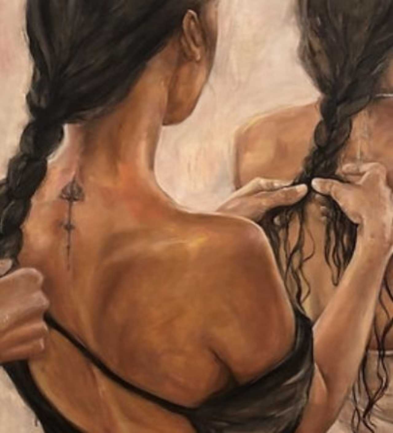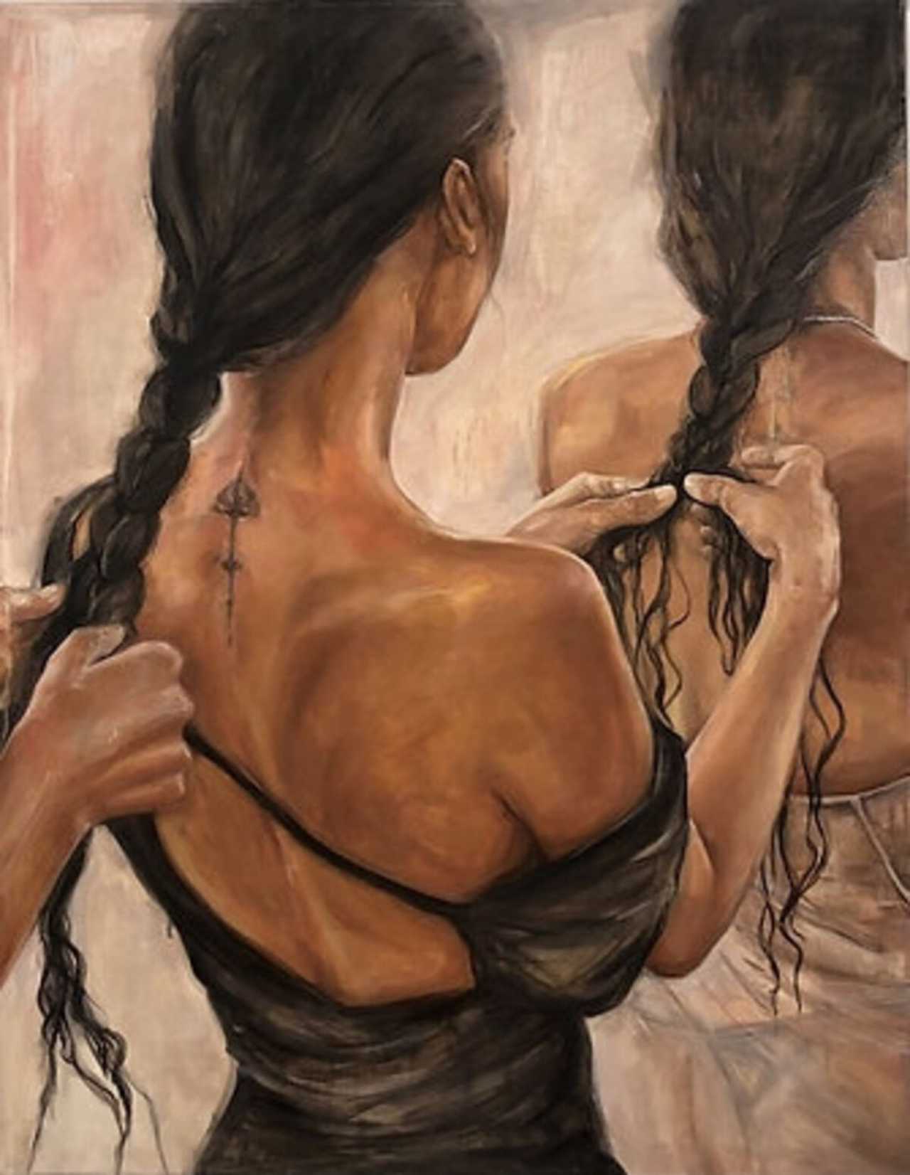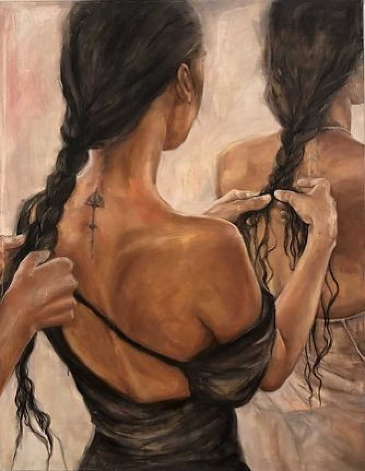 Meryem Tayganskaya, originaire de Crimée, est une artiste talentueuse avec huit ans d&39;éducation artistique formelle, y compris des études dans une université d&39;art. Résidant actuellement à Oslo, elle est connue pour ses peintures à l&39;huile sensibles sur toile, qui ont gagné en popularité dans les pays scandinaves. Meryem participe activement à des événements artistiques et reste engagée dans les tendances de l&39;art contemporain, faisant évoluer continuellement sa pratique artistique. Cette peinture à l&39;huile montre trois filles debout près l&39;une de l&39;autre, dos au spectateur. Les filles se tressent les cheveux, avec des mouvements délicats, créant un sentiment d&39;attention et de tendresse entre elles. Les coups de pinceau doux et les tons chauds utilisés dans la peinture créent une atmosphère calme et intime. Le tableau dégage un sentiment d&39;intimité et de féminité, avec une nuance légère et sensuelle. Les tons chauds et riches utilisés dans la peinture contribuent à son sentiment général de tendresse et d&39;attention. Dans l&39;ensemble, cette peinture à l&39;huile est une représentation belle et délicate du lien d&39;amitié et d&39;attention entre les femmes. Il capture un moment de tendresse et d&39;intimité entre les filles, laissant au spectateur un sentiment de chaleur et de connexion. Les dimensions sont 70 x 90 cm. Huile sur toile.