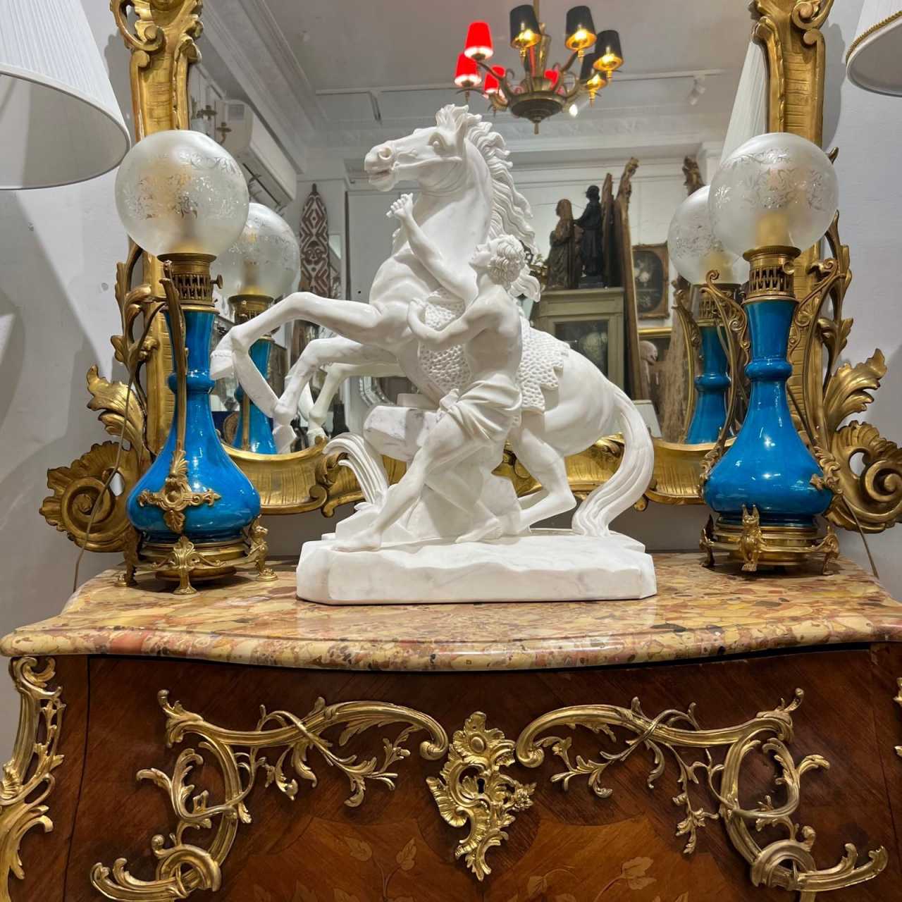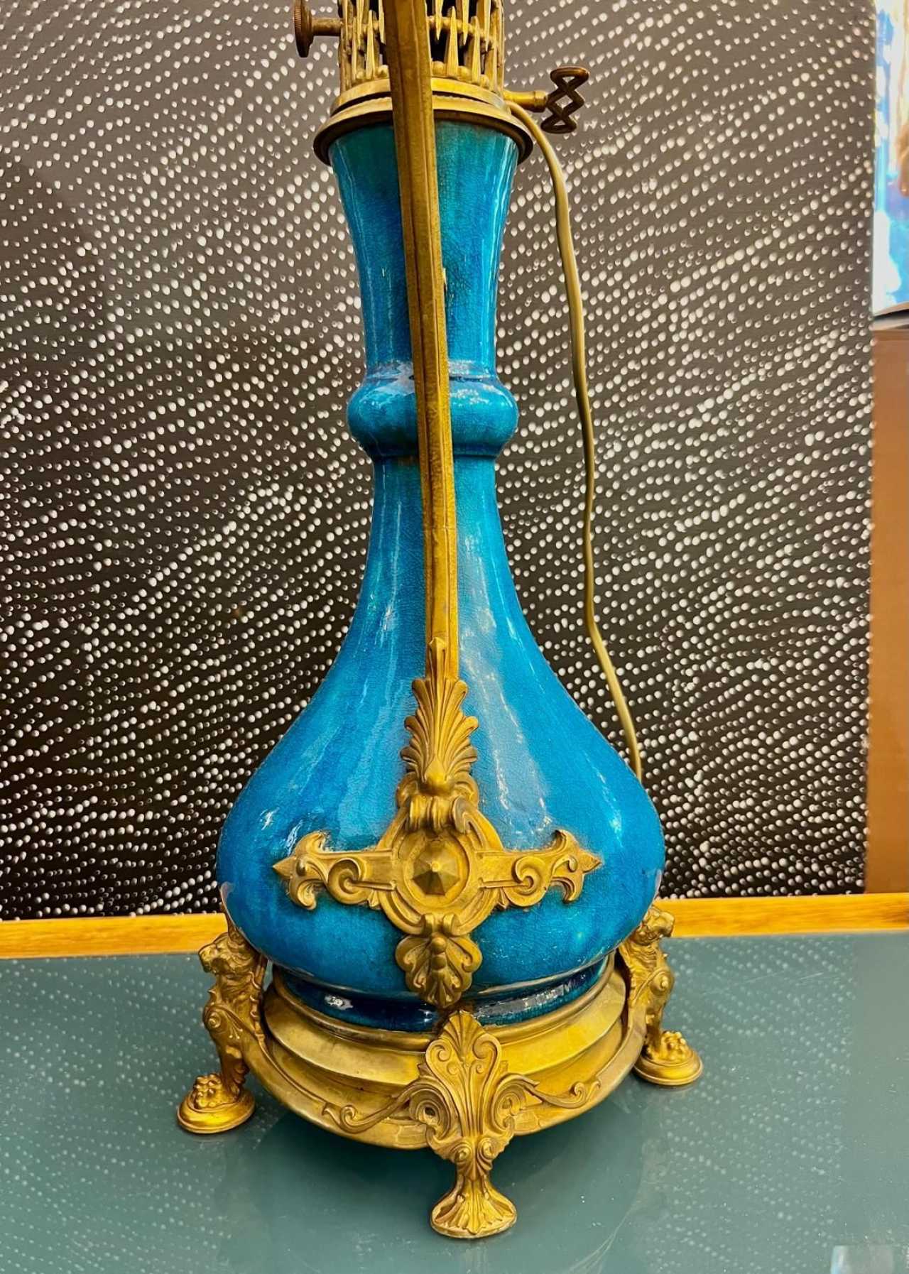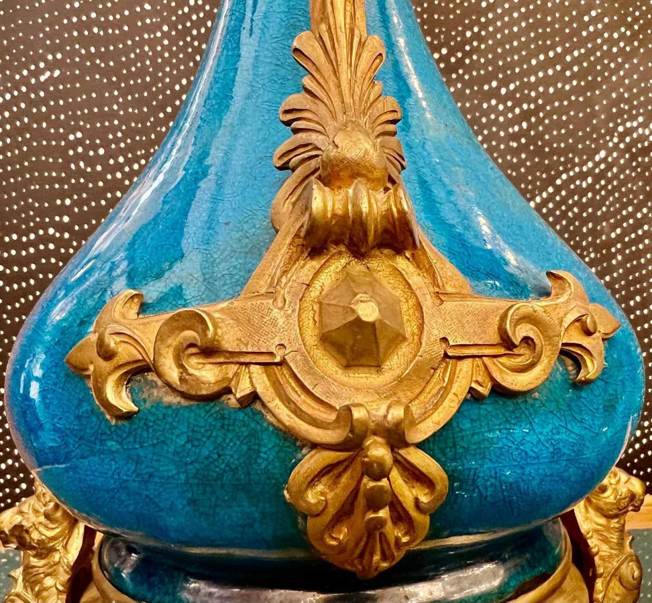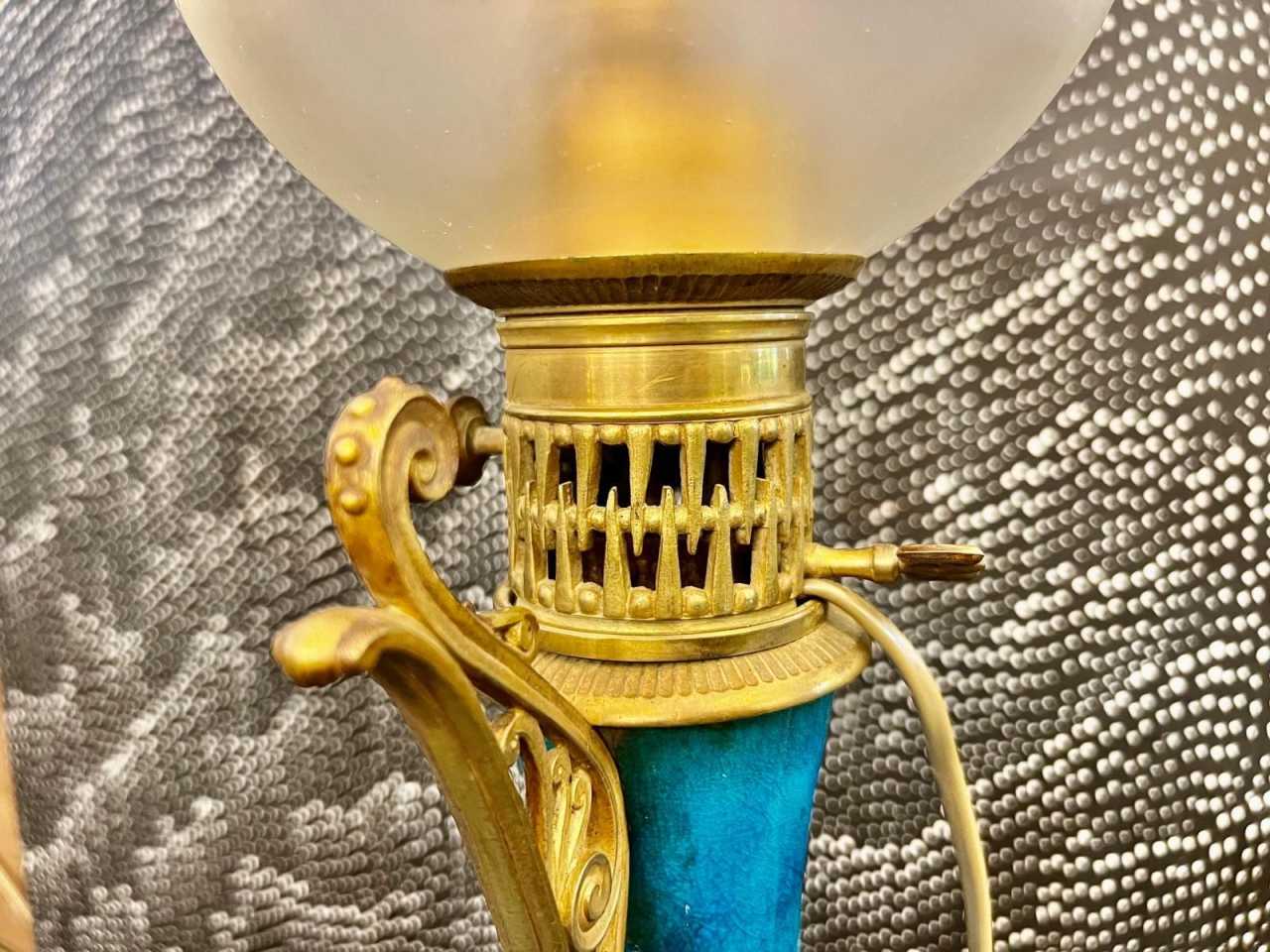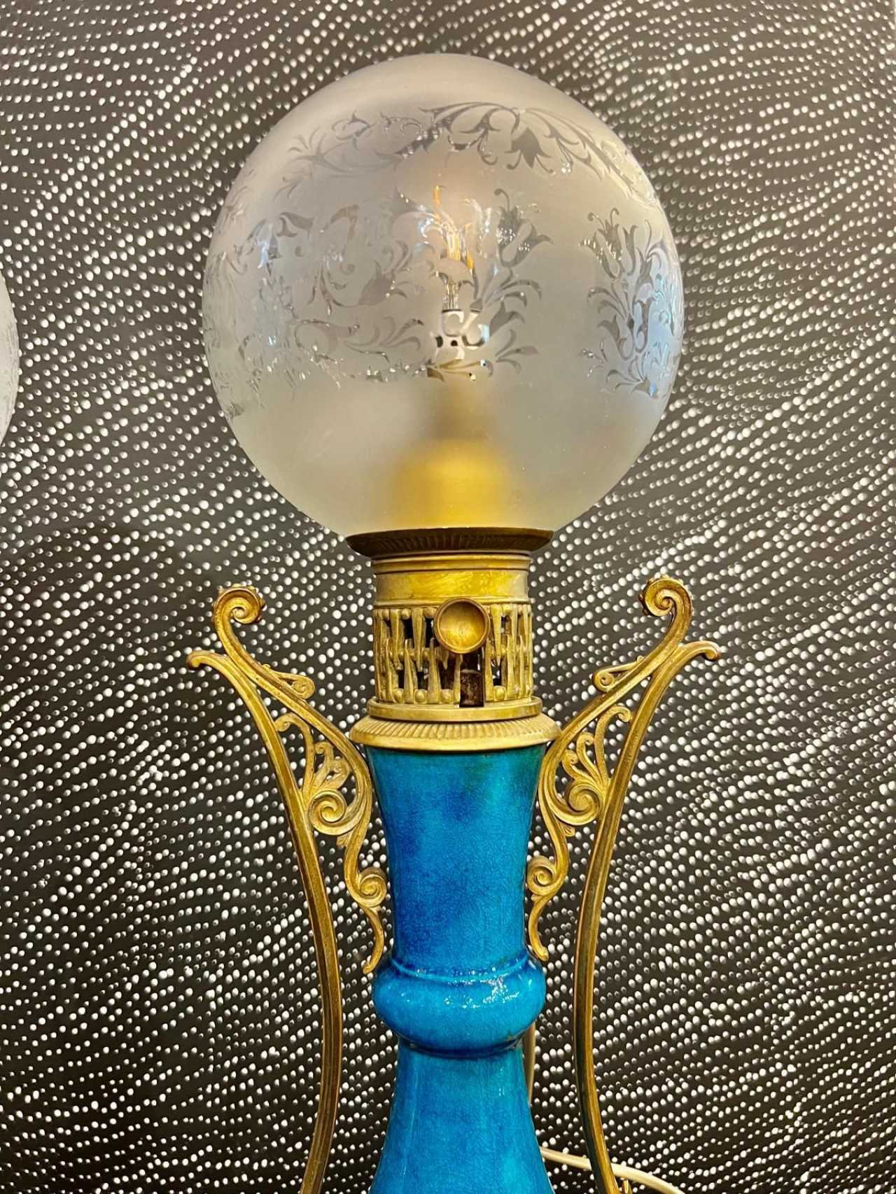 A very beautiful pair of Louis XVI-style baluster-shaped lamps in “Deck” blue glazed ceramic.Each lamp is adorned with large openwork gilded bronze mounts.On either side of each vase is a large diamond-shaped escutcheon framed with palmettes, curls and vegetal ornamentation, which stretches into a rising filante grip and ends in an interlacing frieze.The gilded bronze base is also beautifully crafted with four feet: two sphinxes resting on claw feet and two stylized palmettes.These old oil lamps have been re-electrified, but the chased bronze spout and key have been retained. The globes are decorated with arabesques engraved on satin-finish glass.This pair of lamps is reminiscent of Théodore Decks work, with its characteristic intense turquoise blue. A beautiful, lively ensemble that will add a colorful yet classic touch to your interior.