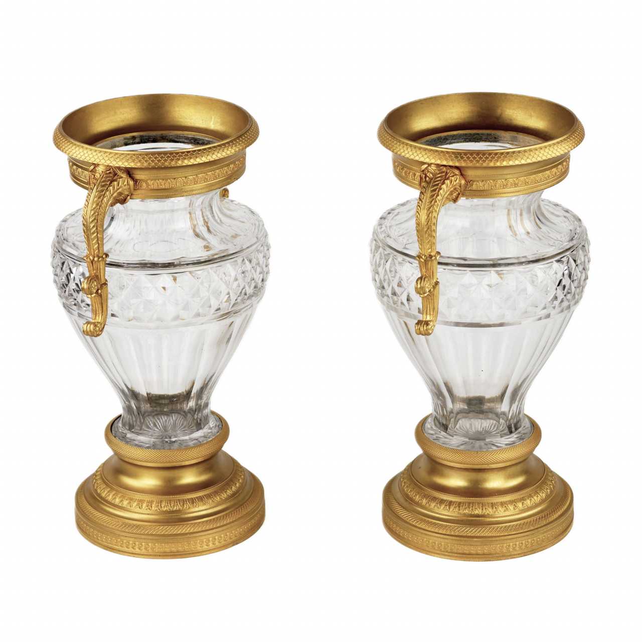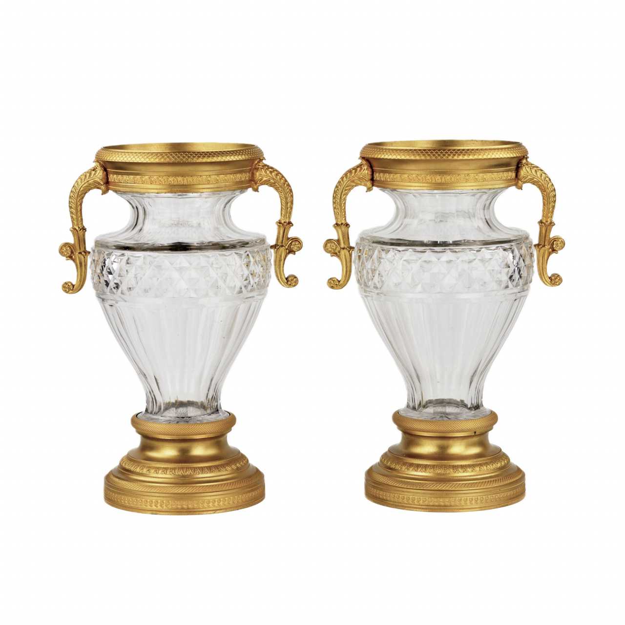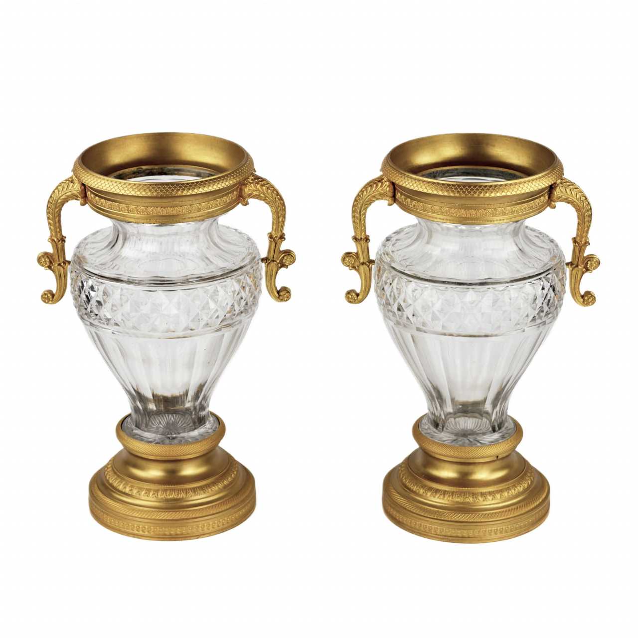 Paire de vases en cristal de forme balustre et ceinture de rustication losangee dans une monture en bronze, à decor de motifs ecailleux, palmettes, feuilles d`eau et fleurs. Les anses sont stylisees en corne d`abondance. Fin XIXe siècle H. 29,5 cm.