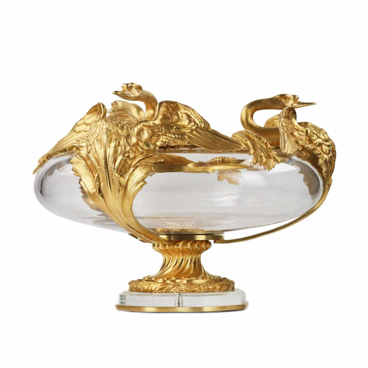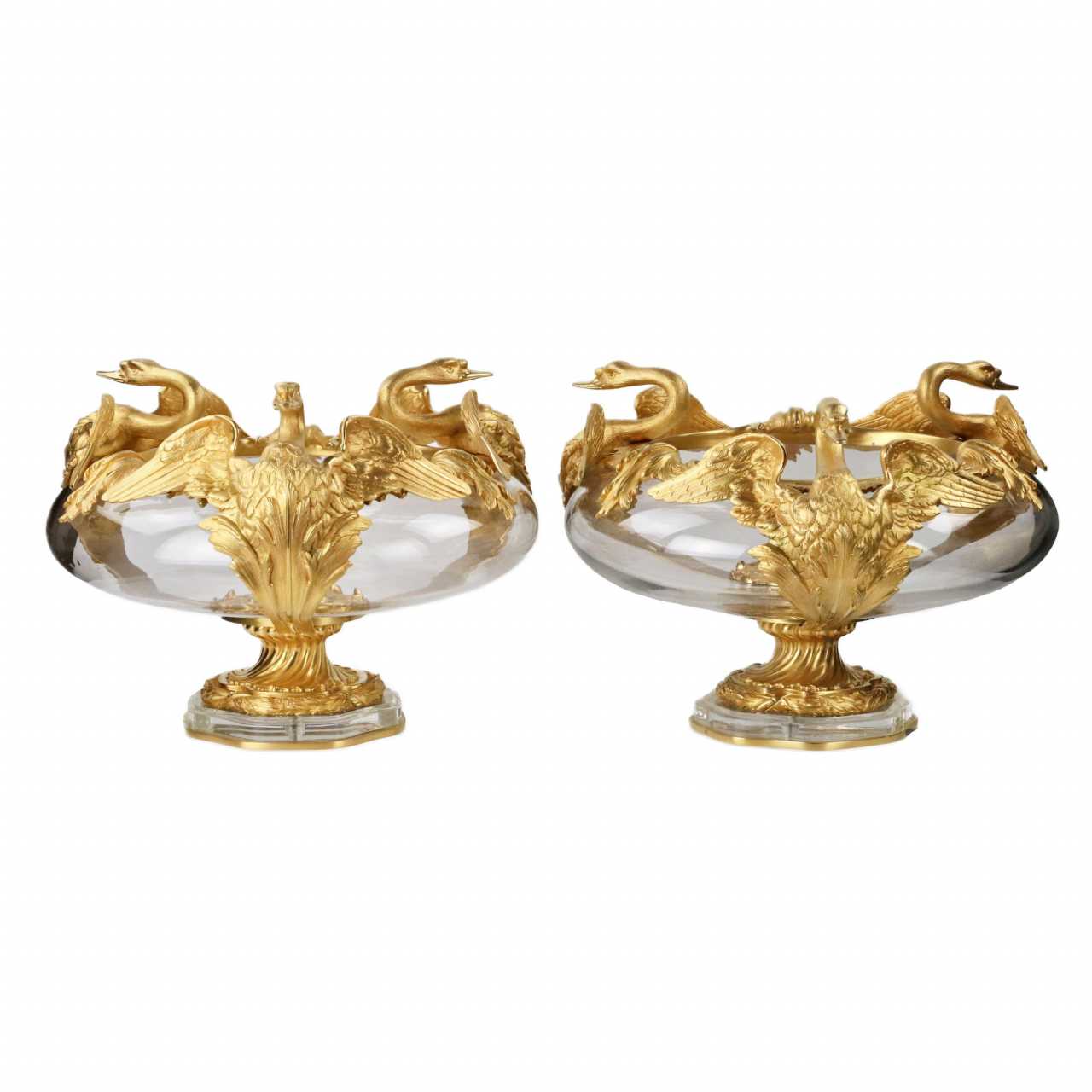 Paire de vases ronds et lourds en verre coule et bronze dore à motif de cygne. Ils representent un ensemble solide et dynamique sur une tige alliee au verre et au bronze. La puissante composition dont, dans le cadre, reprend un motif pseudo-Empire - un cygne majestueux deployant ses ailes. Hauteur : 36 cm Diamètre : 46 cm France, XXe siècle.