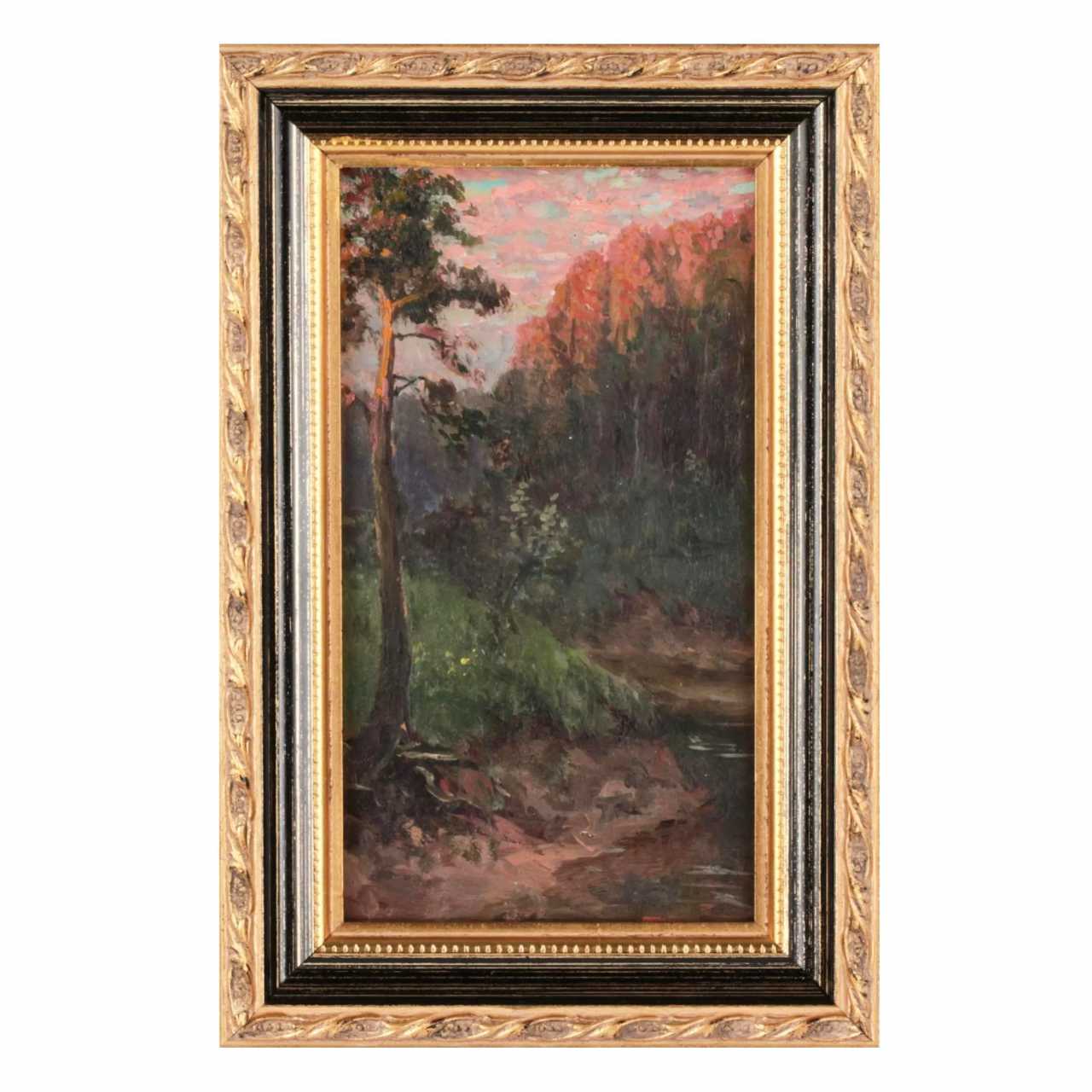 Paysage au coucher du soleil sur la rivière. Représente le détour dune petite rivière, surplombant une haute berge, et la cime de la forêt dans les rayons du coucher du soleil. Le premier plan forme un talus bas avec un pin et un buisson sur une colline. Russie 20e siècle. Dimensions de lœuvre : 17x10 cm.