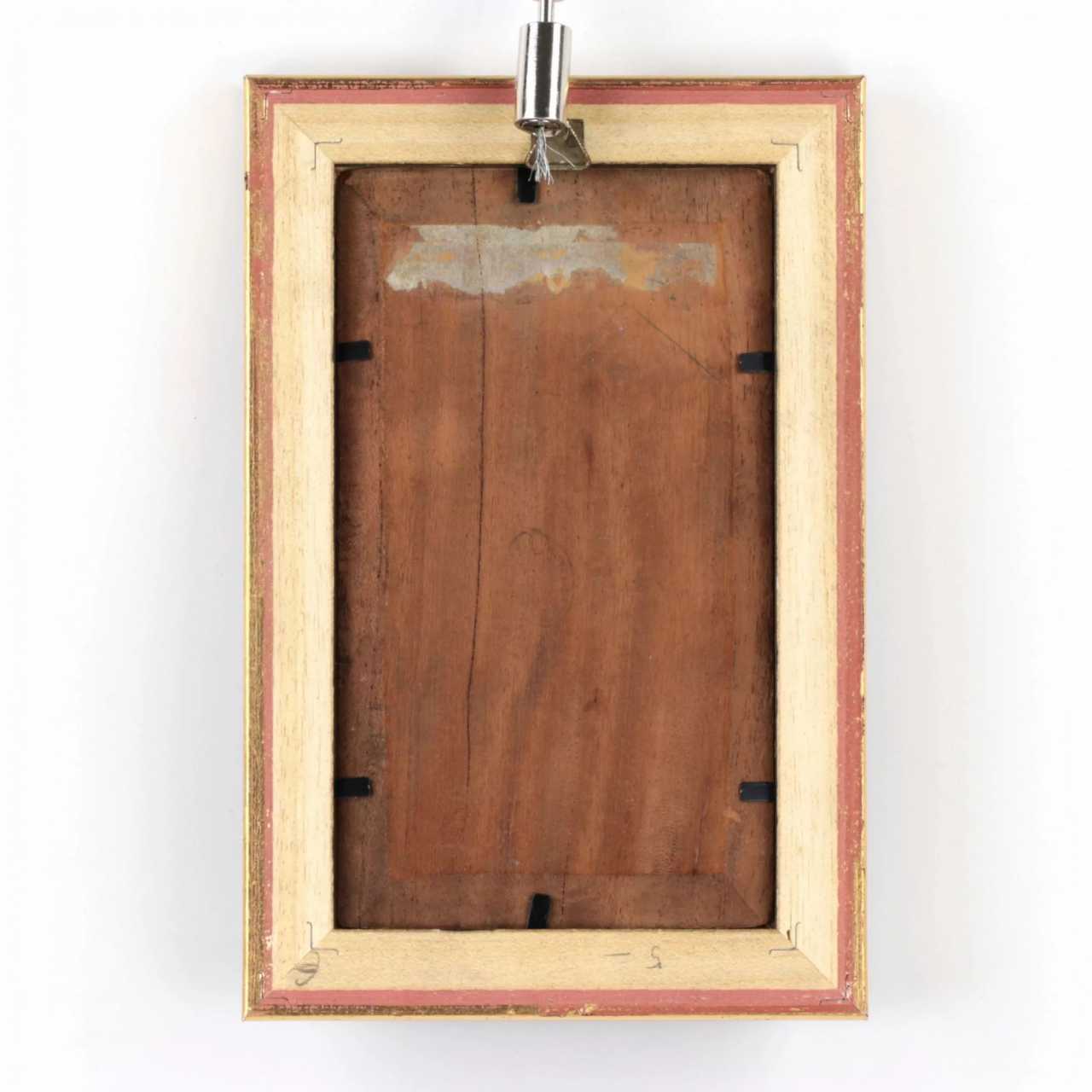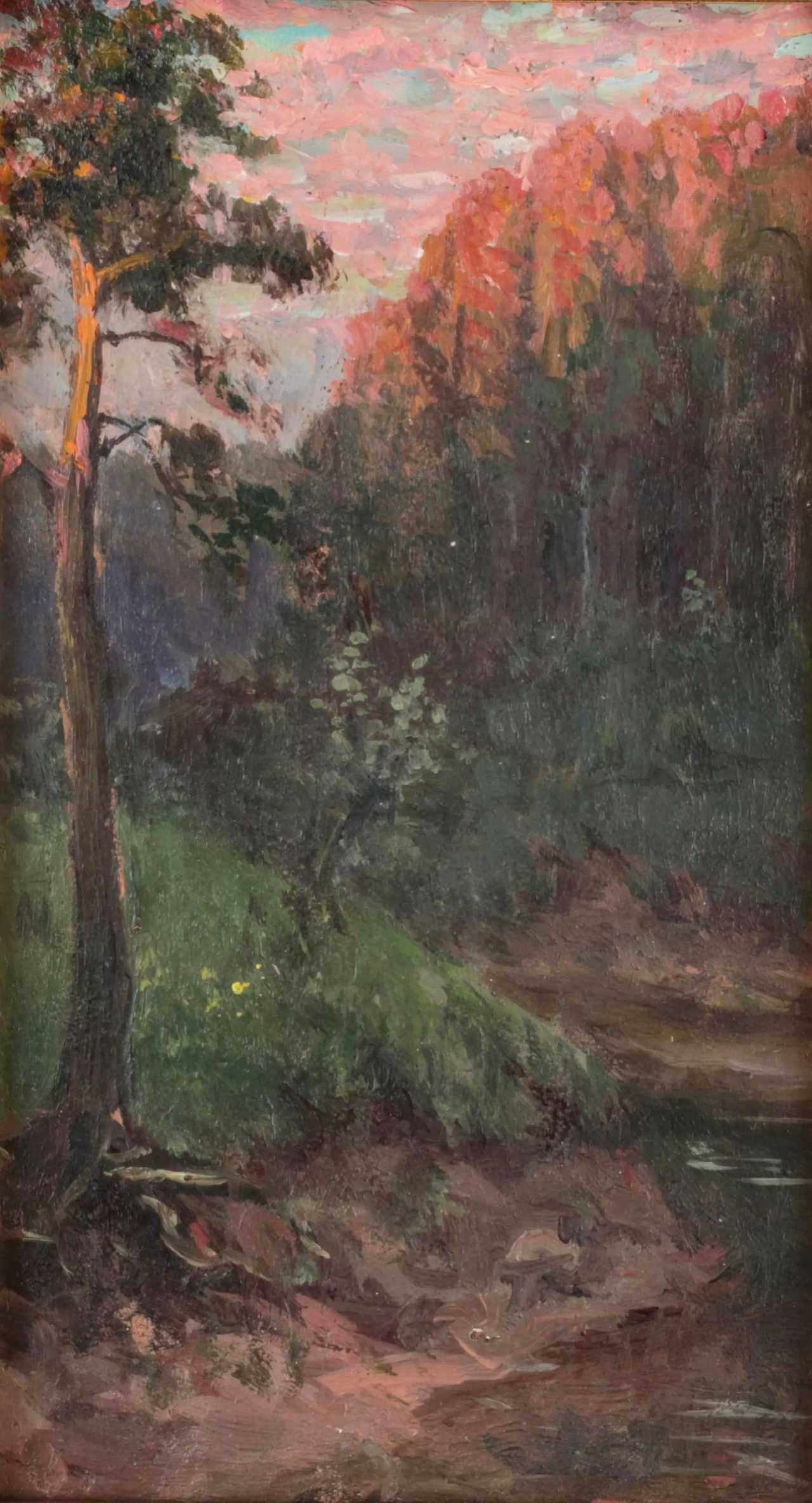 Paysage au coucher du soleil sur la rivière. Représente le détour dune petite rivière, surplombant une haute berge, et la cime de la forêt dans les rayons du coucher du soleil. Le premier plan forme un talus bas avec un pin et un buisson sur une colline. Russie 20e siècle. Dimensions de lœuvre : 17x10 cm.
