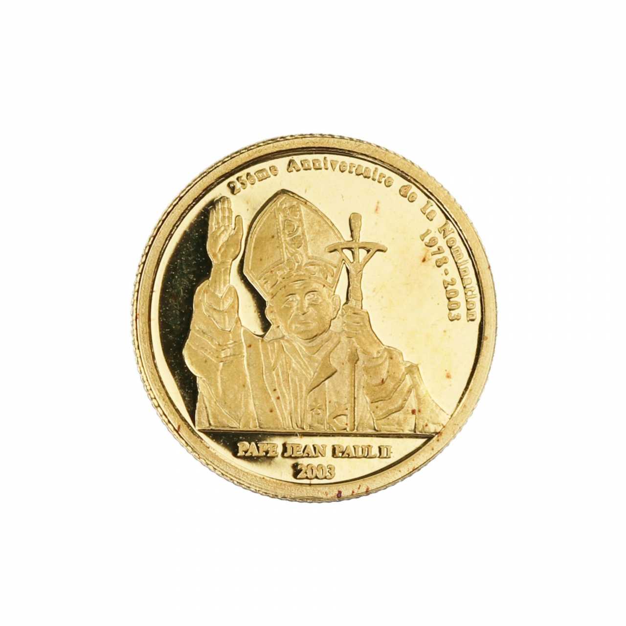 Pièce d`or de 20 francs de la Republique du Congo. 2003 D`un côte un lion, de l`autre Jean-Paul II. Pièce de monnaie dans un recipient en plastique. Poids total : 4 gr.
