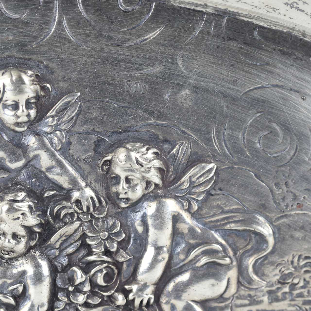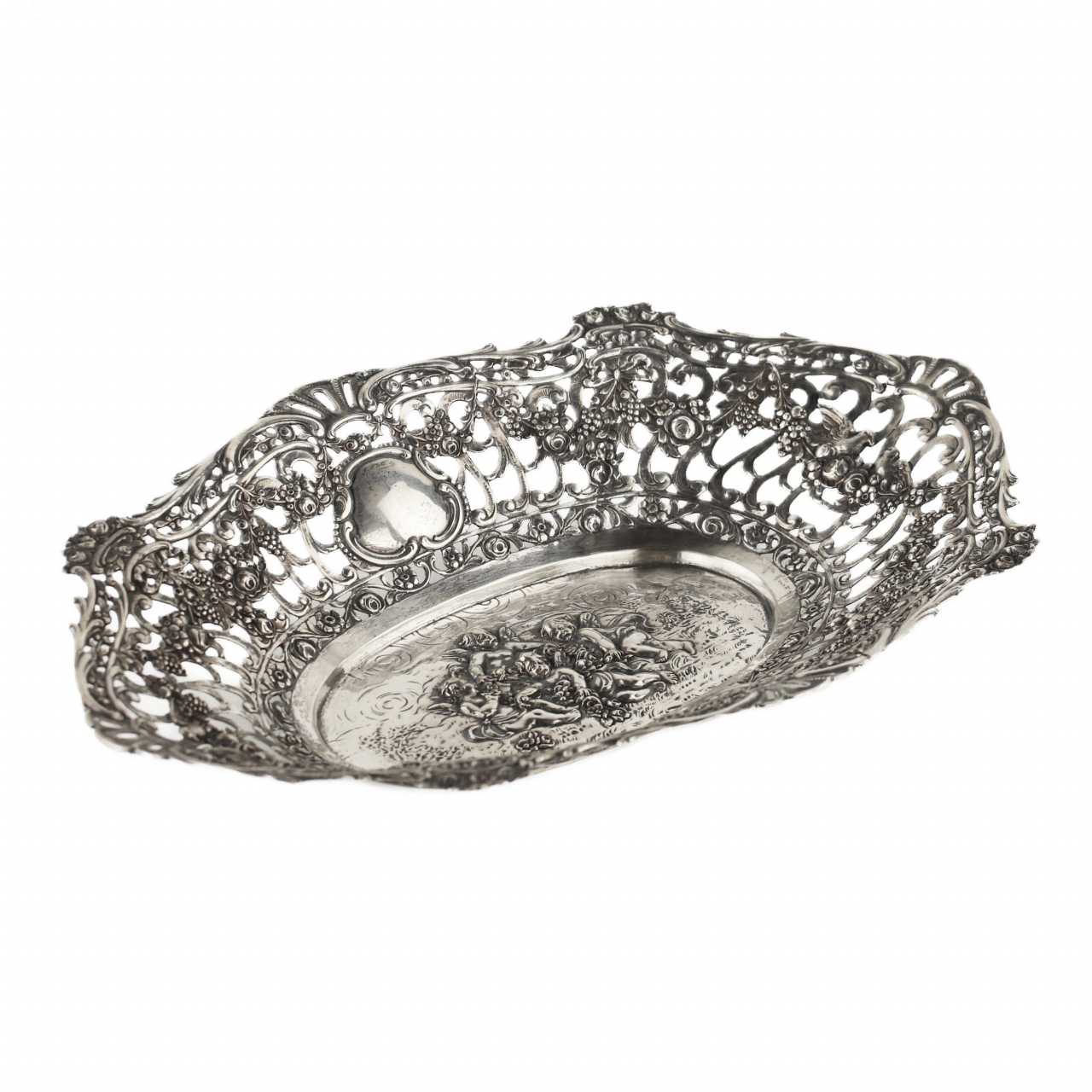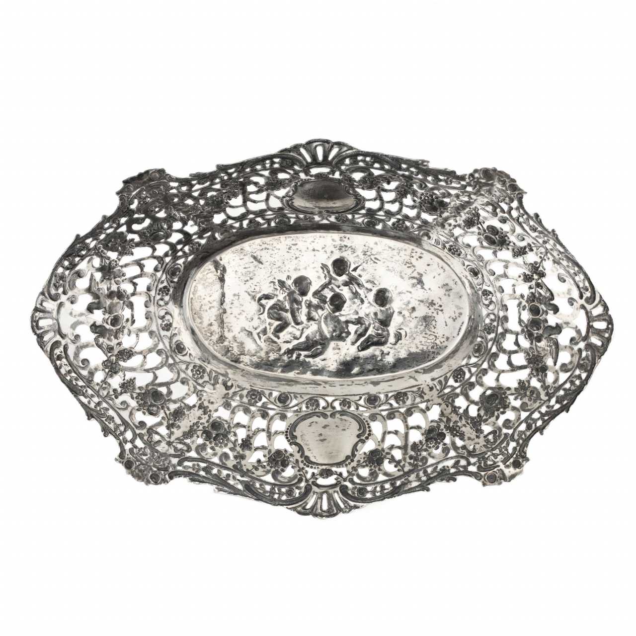 Plat decoratif en argent de style neo-rococo, à decor decoupe des champs, vignettes sous les initiales; avec des guirlandes de fleurs et de raisins, autour des amours gambadant dans le pre fleuri.L`Allemagne de Kaiser. 800 argent standard.Poids: 236 g
