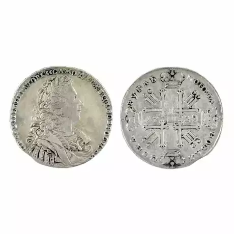 Rarete numismatique. Rouble d`argent de 1729 de Pierre II. A : Buste d`apparat de Pierre II avec un virage à droite. Au revers : l`heraldique originale d`une croix couronnee de quatre P, aux angles desquels se trouvent des deux. Poids : 27,74 grammes. Diamètre : 40 mm.