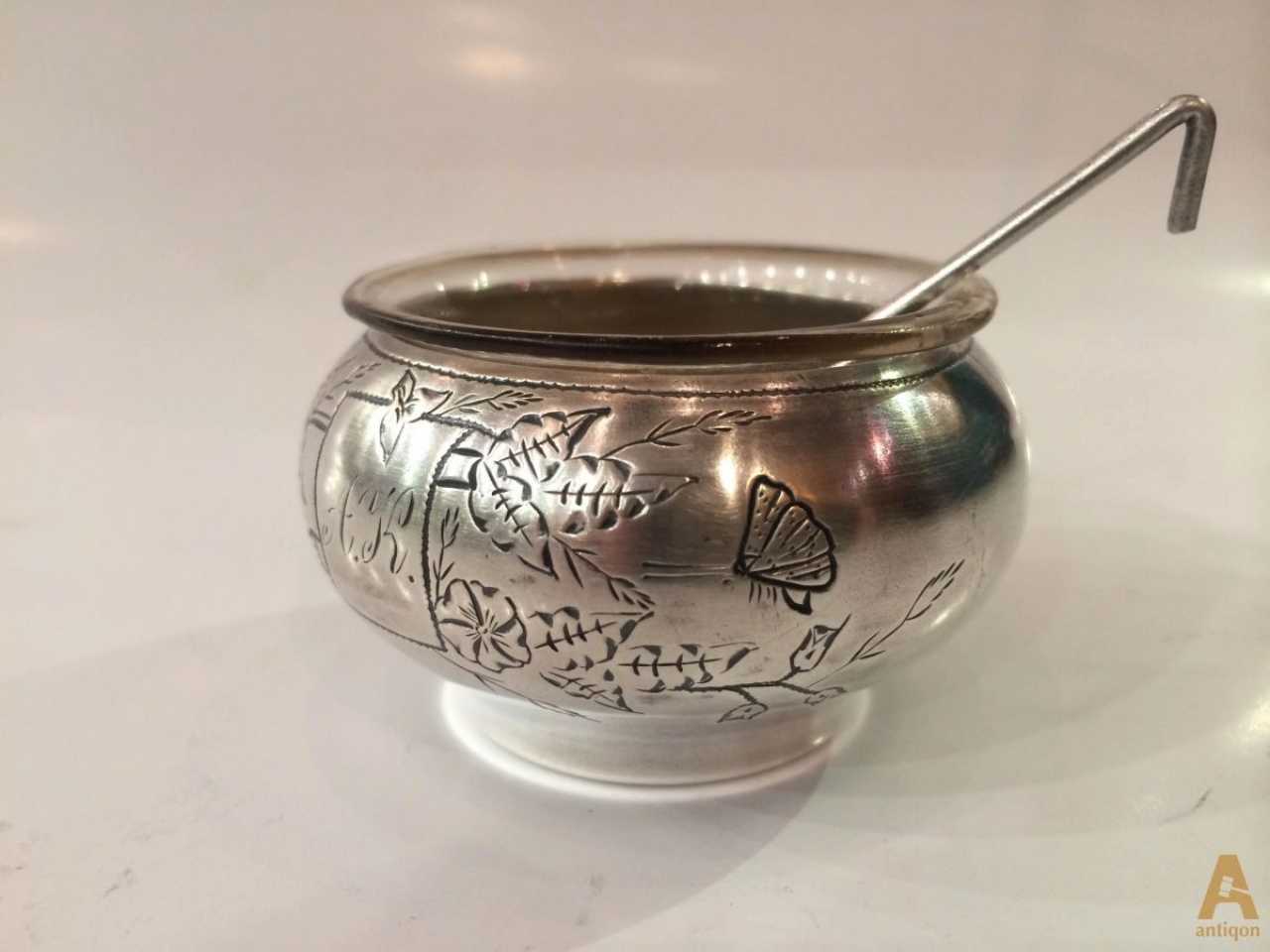 Russian salt, pot form. Includes silver salt, glass insert and spoon. Stamp of master, 1886, silver weight - 45gr.