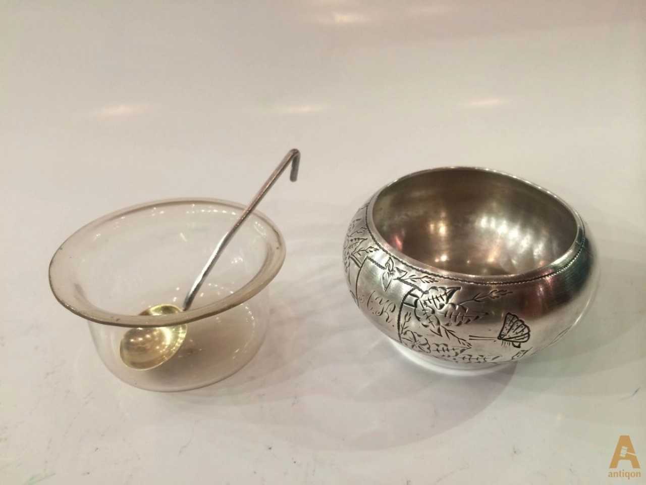 Russian salt, pot form. Includes silver salt, glass insert and spoon. Stamp of master, 1886, silver weight - 45gr.