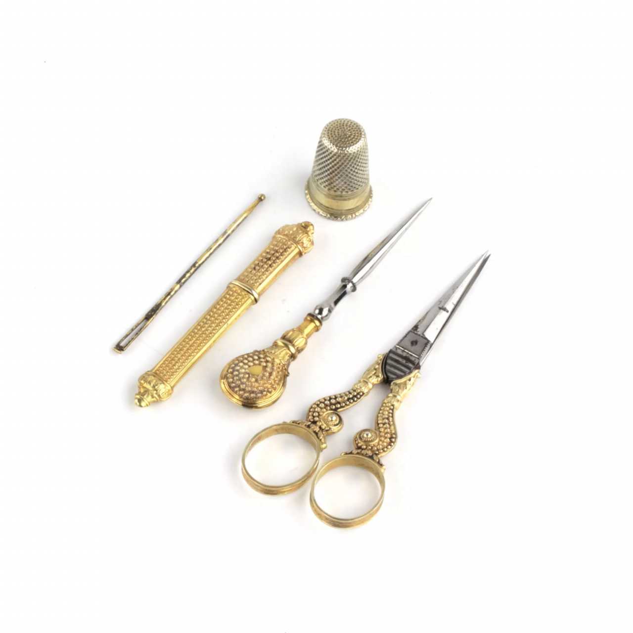 Sac de voyage à coudre dans une caisse en bois. Comprend : ciseaux, de à coudre, poinçon, grande aiguille, pelote d`epingles et propre etui avec marqueterie incrustee de violet sur le couvercle.