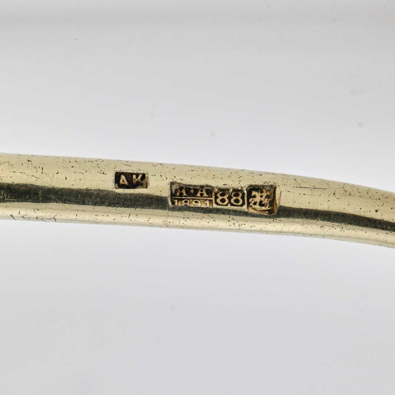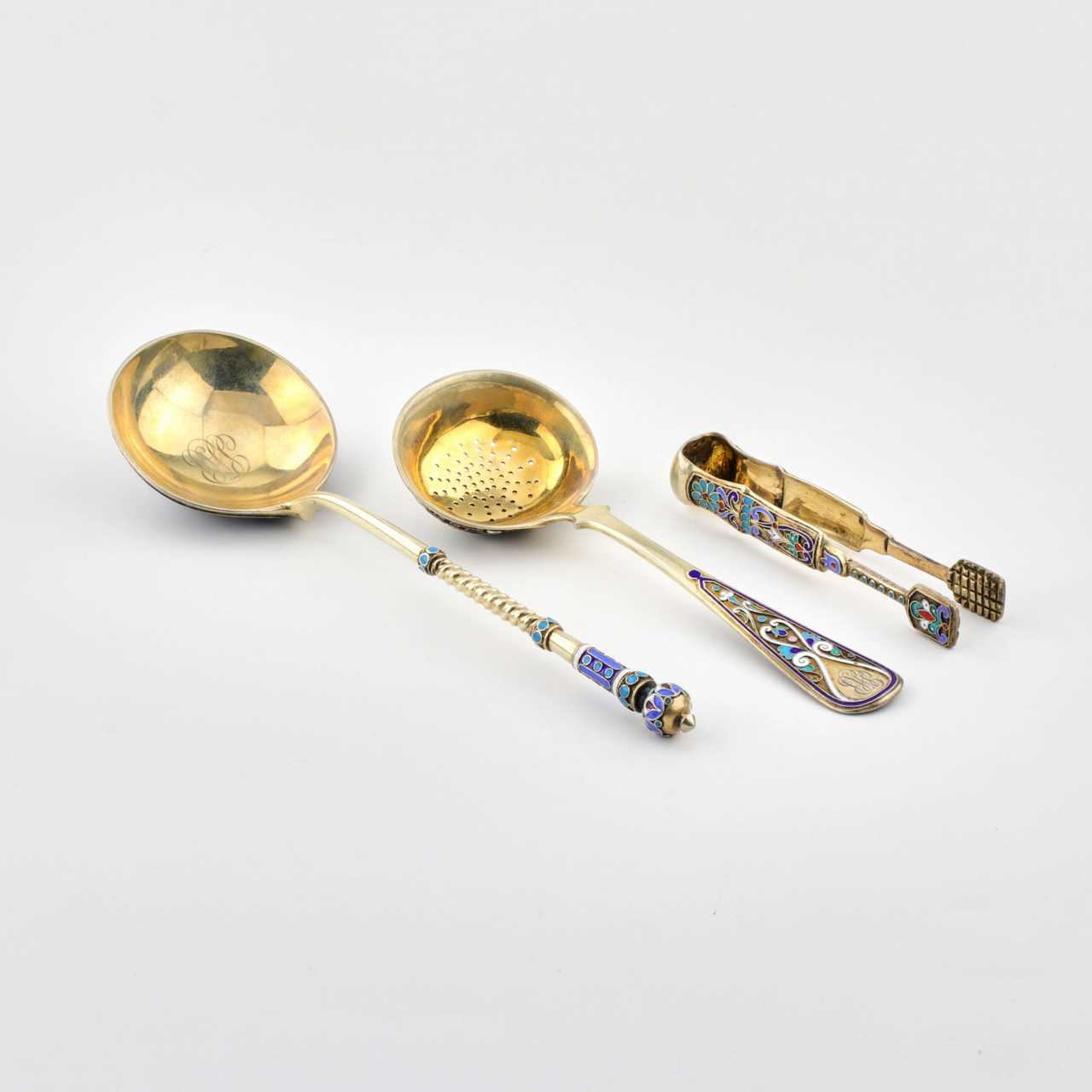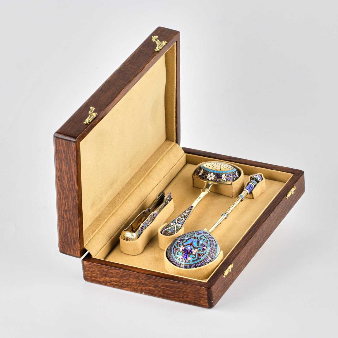 Service à the en argent en email cloisonne avec le slogan Bon appetit sur la cuillère. Comprend: grande cuillère à confiture, passoire à the et pinces à sucre Moscou 1891. 88 finesse d`argent. Marque du maître: AK. Probablement Antip Ivanovich Kuzmichov. Proprietaire d`une fabrique d`argenterie depuis 1856, qui a prospere dans les annees 1890. Travail avec les emaux: verre, salière, pot à lait - Musee historique d`État. Postnikova - Losev p. 207. Poids total des produits: 183 gr.