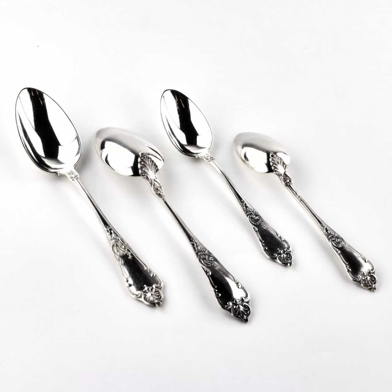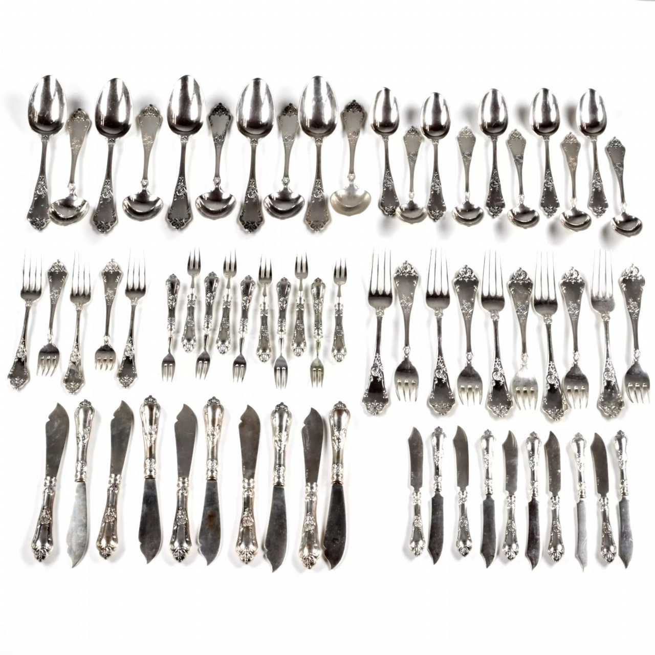 Service de couverts en argent royal, valeur de 84 dosages, atelier de Gustav Klingert. Moscou 1908-1917 Les formes classiques de poids total du produit sont combinees avec des boucles fantaisistes et precises, un decor baroque. Comprend: 10 cuillères à soupe.10 fourchettes de table.6 couteaux de table.10 cuillères à dessert.5 fourchettes à dessert.10 couteaux à poisson.10 couteaux à fruits.10 fruits des couteaux.