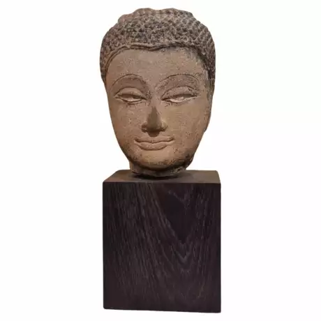 17th century Thai Buddha head (Kingdom of Ayutthaya) carved on sandstone with a serene, delicate expression.The finesse of the master sculptors work is remarkable here: the large almond-shaped eyes with half-closed eyelids advocate introspection and humility, while the fine, well-defined mouth with pronounced corners preaches benevolence and universal love.He wears the Ushnisha, a cranial protuberance characteristic of Buddha and a symbol of his knowledge.This Buddha exudes emotion and wisdom, inviting the viewers eye and mind to meditative calm and enlightened concentration.This collectors item stands out for its fine craftsmanship and its expression of wisdom, from which emanates great spirituality.Traces of gold on the stoneware.The historic city of Ayutthaya, founded in 1350, was the second capital of the Siamese kingdom after Sukhothai. It enjoyed a period of prosperity between the 14th and 18th centuries, establishing itself as one of the worlds largest and most cosmopolitan urban areas. Ayutthaya also played a key role as a center of diplomacy and international trade. In the early 16th century, European travellers ranked it among the three great Asian powers, alongside Vijayanagar in India and La Calle. Considered the forerunner of modern Thailand, the kingdom of Ayutthaya occupies a major place in the countrys history. Its territory covered part of present-day eastern Myanmar (Burma), western Laos and as far north as present-day Malaysia. However, it was destroyed by the Burmese in the 18th century.