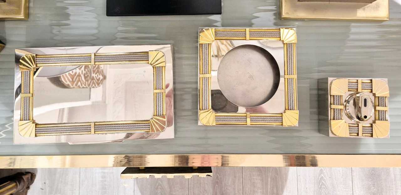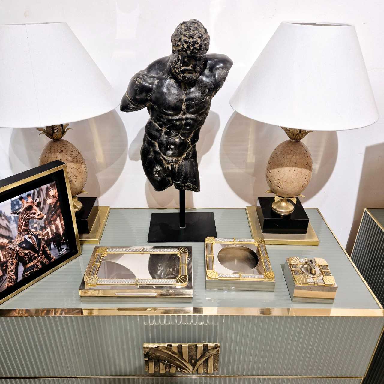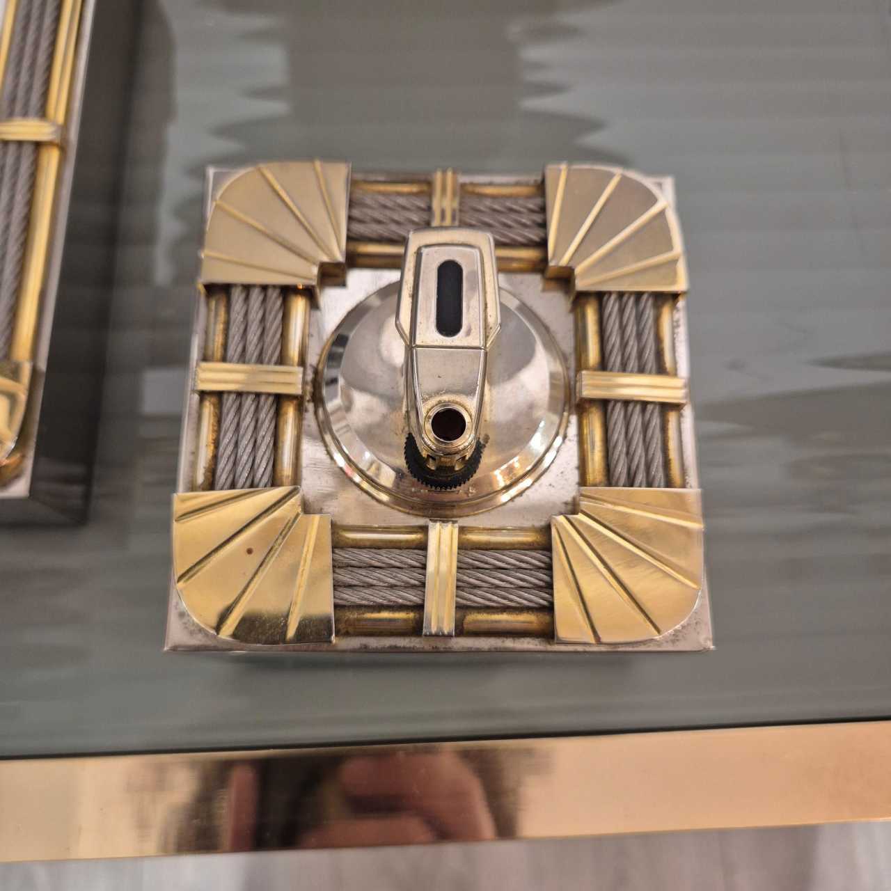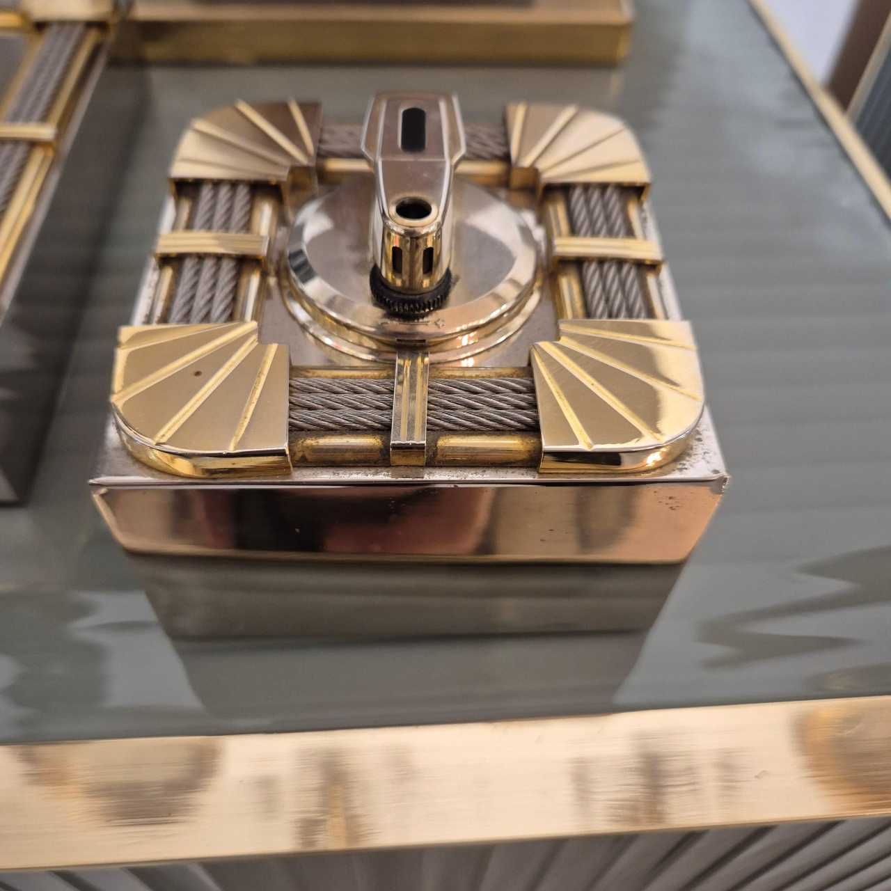 Smokers set signed FRED from the Force 10 collection, consisting of a lighter, ashtray and cigar box in silver-gilt metal with the brands typical stylized rope-style braided steel decoration. all three pieces are signed FRED.A very rare set, unobtainable on the market and in very good condition: the lighter works perfectly, dating from the 1960s1970s.Part dimensions:LighterWidth 9.5 cmDepth 9.5 cmHeight 5.5 cmAshtrayWidth 16 cmDepth 16 cmHeight 3.5 cmCigar caseWidth 25 cmDepth 15 cmHeight 4.5 cmTHE FORCE 10 COLLECTION FROM FRED“One day, my eldest son had the amusing idea of braiding marine cables, attached at both ends by rivets, to make a bracelet that he gave to his wife. For his birthday, he imagined the same bracelet with a gold clasp in the shape of a marine snap hook. To make it even more precious, he added links along the length of the bracelet. Thus was born the first jewel in the Force 10 line in 1966. Carrying the passion for the sea and sailing of Fred Samuel and his family, the Force 10 bracelet is today one of the emblems of the Maison. The Force 10 collection has become a symbol of courage, perseverance and self-confidence.By daring to orchestrate this unexpected meeting of a braided steel marine cable and a gold shackle, two materials that until then had seemed to oppose each other, FRED has made jewelry history. A formidable avant-garde vision, it has since given rise to a collection that is both casual and jewel-like.Synonymous with great resistance, strength and willpower, the Force 10 collection reveals precious know-how through the solid, meticulous braiding of its cable. This collection is a natural extension of the iconic jewels sporting values, character and powerful identity. And they reflect a constant thirst and joie de vivre, a taste for freedom, the great outdoors and adventure.The Force 10 collection is a manifesto of style and audacity for the determined and passionate, for those who stop at nothing, not even the limits of the horizon.