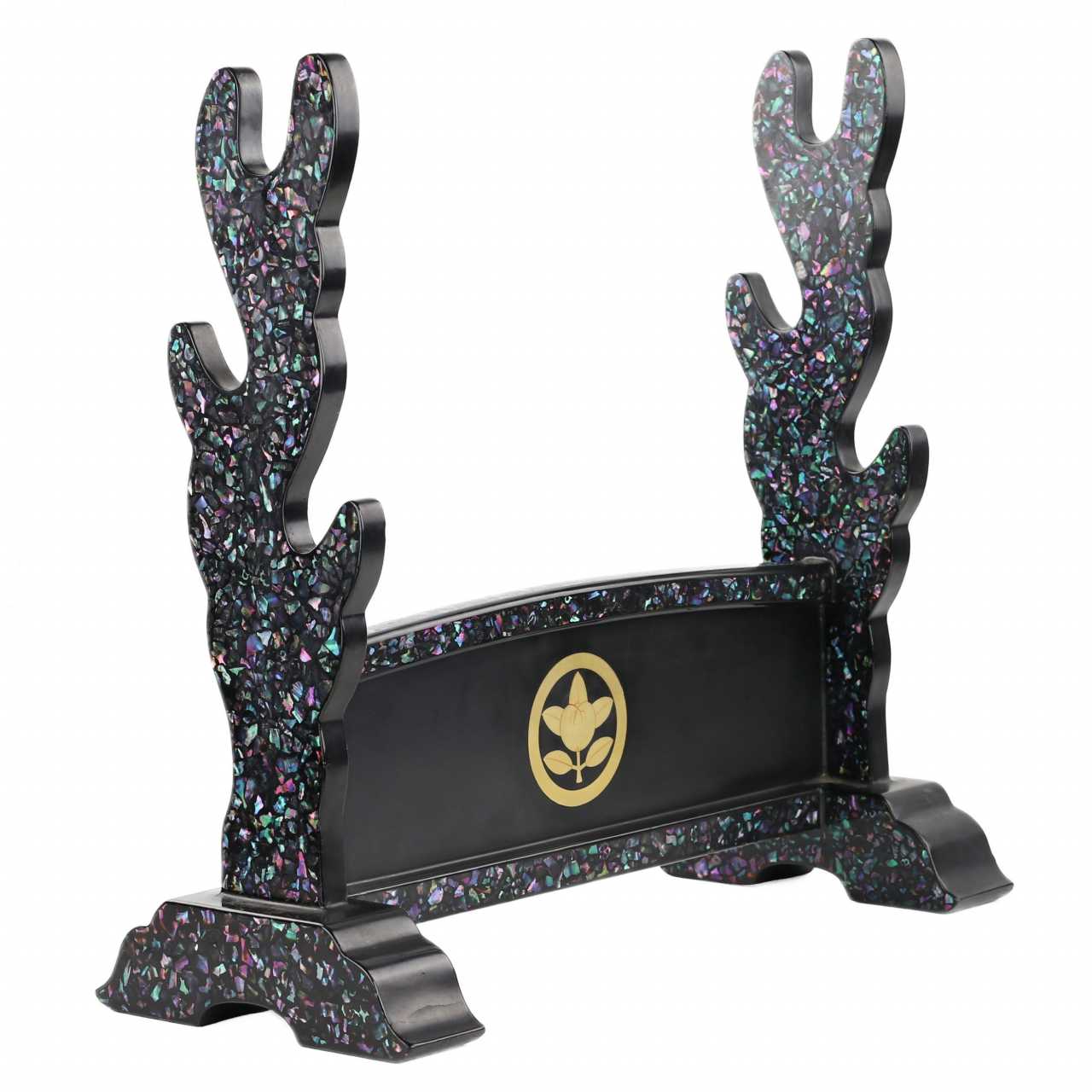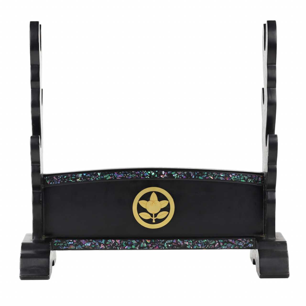 Support de sabre (katana`kake) en bois laqué noir, conçu pour accueillir trois épées. Il est orné d`inserts de nacre sur les côtés et les bords. Sur la face avant, un blason figurant un mandarin entouré d`un cercle est réalisé en laque dorée Dimensions : Hauteur 42,5 cm, Largeur 44 cm.