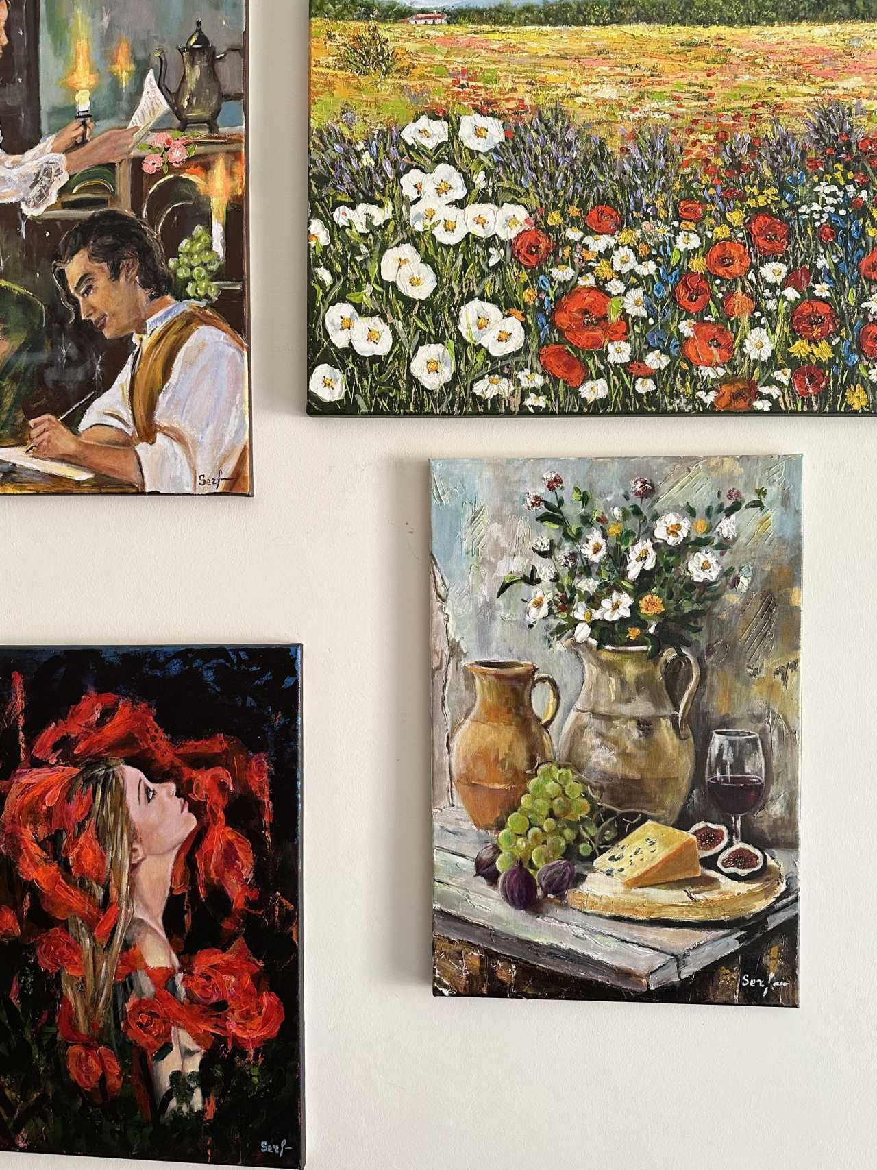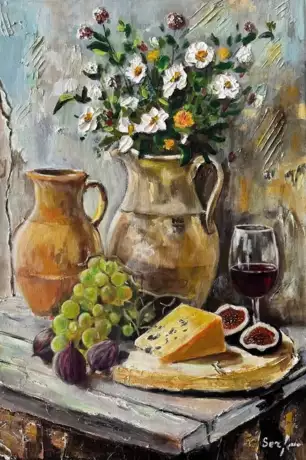 Pintura a óleo com uma natureza-morta composta por um vaso de flores, uma jarra, uvas, queijo e um copo de vinho tinto. A composição é rica em cores e texturas, criando uma atmosfera acolhedora e apetitosa.Enviarei por correio registado ou entrega em mão a Santarém custo de envio incluído