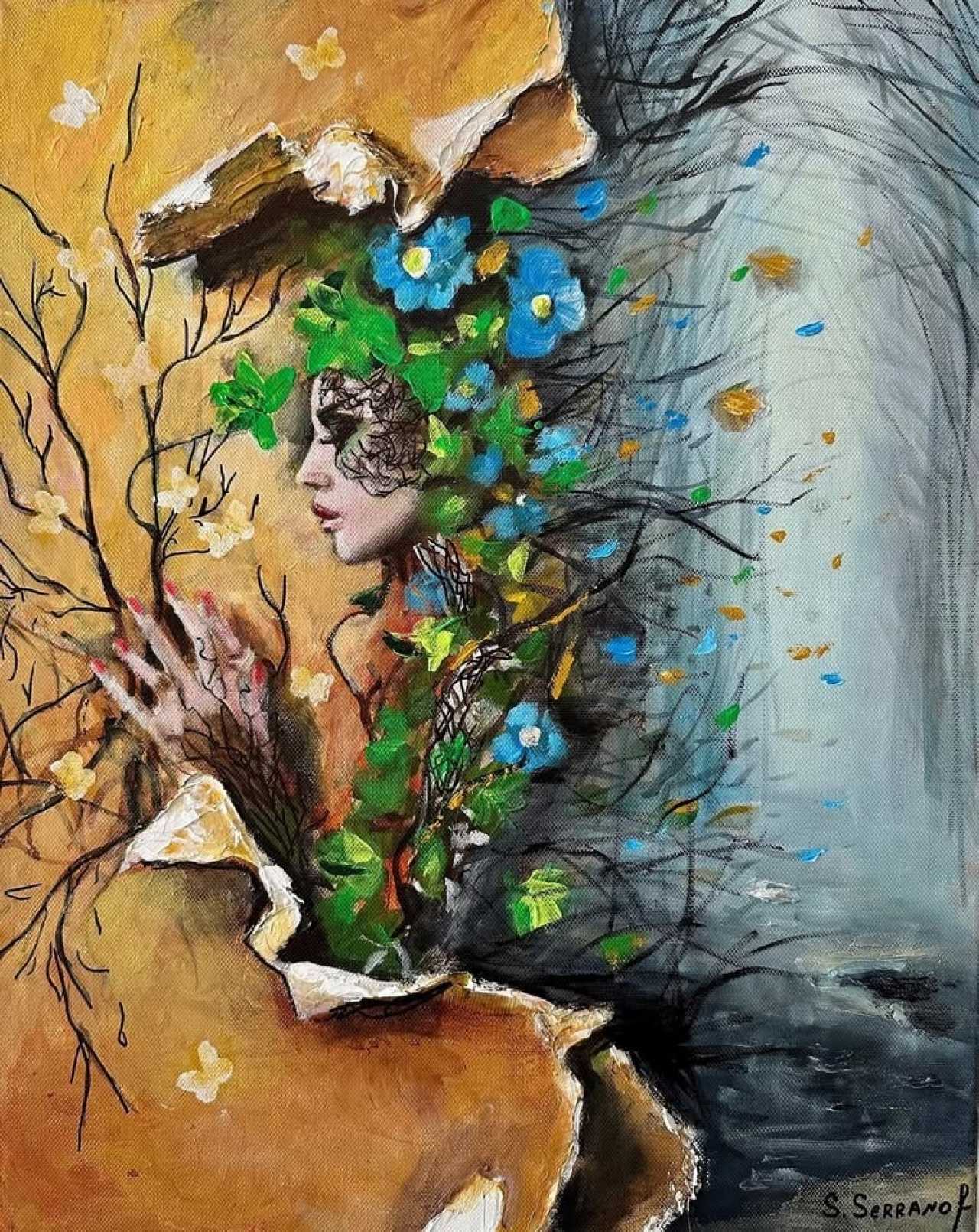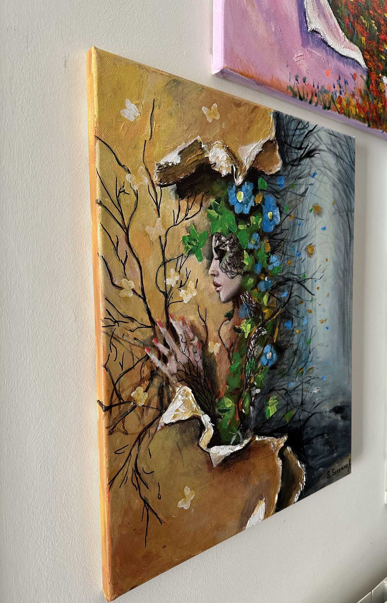 Pintura abstrata em técnica mista, com dimensões de 40x50 cm. A obra apresenta uma figura feminina envolta em elementos naturais, como flores e folhas, criando uma composição vibrante e expressiva.Enviarei por correio registado ou entrega em mão a Santarém custo de envio incluído