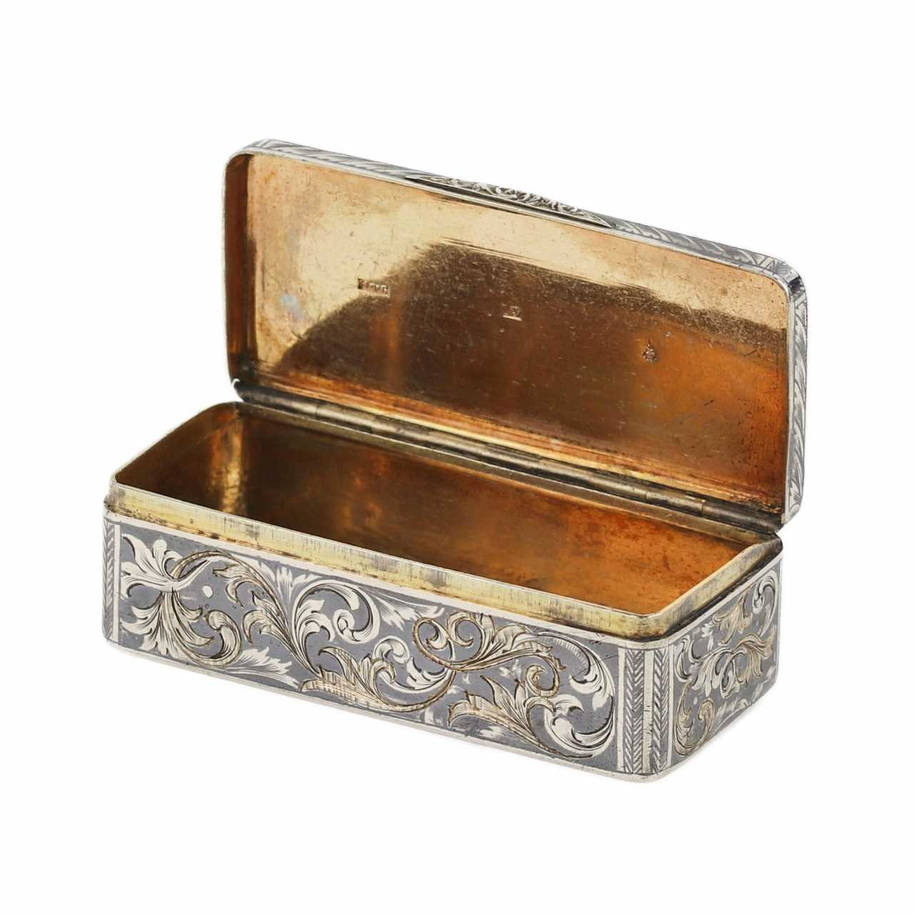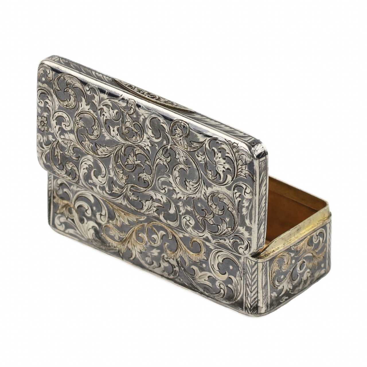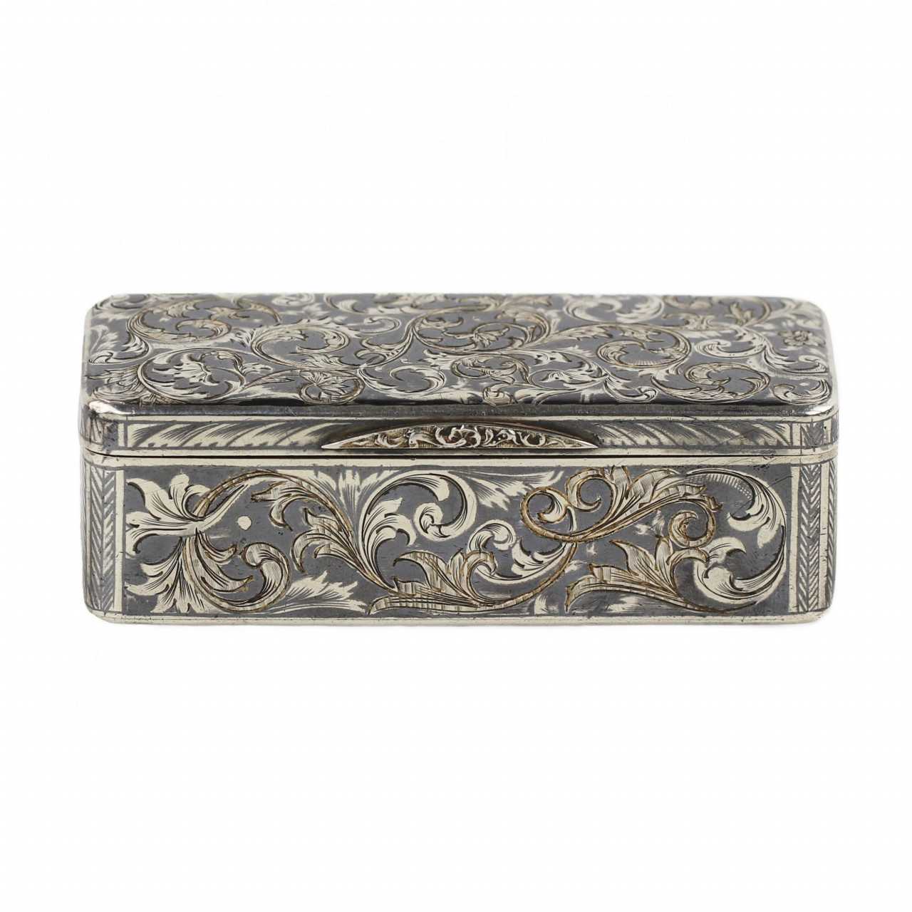 Tabatière russe en argent nielle, à coins lisses et vagues à décor floral. Marques : Nom d`un maître inconnu de l`ONF. Poinçons du Bureau d`analyse du district de Moscou, qui représentent : le nombre « 84 », certifiant l`étalon argent ; « Les armoiries de Moscou – Saint Georges le Victorieux à cheval, tuant un dragon avec une lance – sont un signe d`identité d`État correspondant au premier quart du XIXe siècle ; Dimensions : longueur 9 m, largeur 4 cm, hauteur 2,8 cm Poids total 121 g.