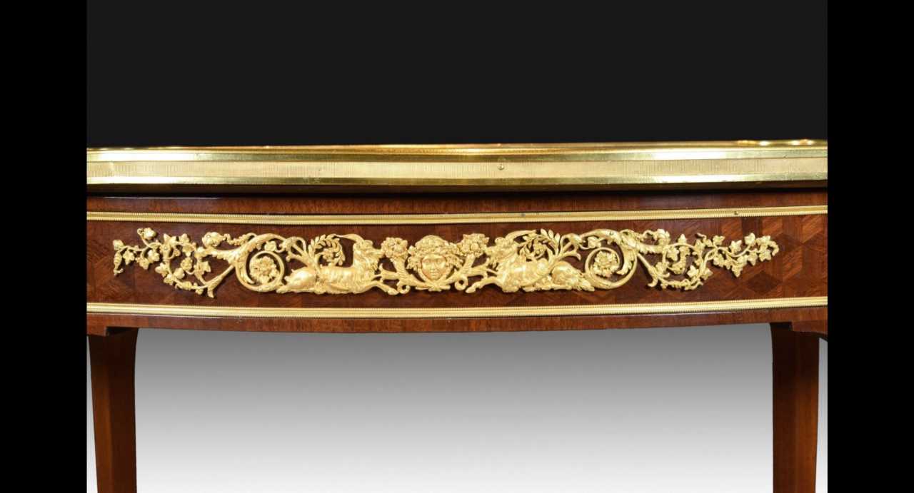 Table basse ovale en acajou et bronze dore de style Louis XVI. Fin XIXème siècle daprès le modèle dAdam Weisweiler. Le plateau de la table a une forme proche dun ovale avec quatre saillies semi-circulaires, auxquelles sont fixes dans la partie inferieure delegants pieds de table figures avec des mascarons dores. Les superpositions en bronze et la bordure lineaire du bord du couvercle et de ses côtes en bois (taille de table) sont realisees avec un moulage, un gaufrage et une dorure de haute qualite. Le plateau de la table est decore sur toute sa surface dun motif de marqueterie geometrique, qui contraste joliment avec le lisere dore de la table. Le decor reprend des motifs traditionnels de lepoque du classicisme, realises dans lesprit antique - motifs de rubans et de fleurs, capitules, cornes dabondance, figurines de beliers couches, têtes de jeune fille. Les pieds de la table sont completes en partie basse par des plaques en bronze en forme de sabot à motif feuillage en relief. Dans la partie avant de la table (au niveau de la taille) se trouve un couvercle de tiroir. Celui-ci, en raison du decor, semblable au decor repetant le decor en bronze dore des autres côtes de la taille de la table, est soigneusement cache. Materiau : bois, placage dacajou, sculpture, polissage, bronze, moulage, gaufrage, Dimensions : 99 x 64 x 72 cm.