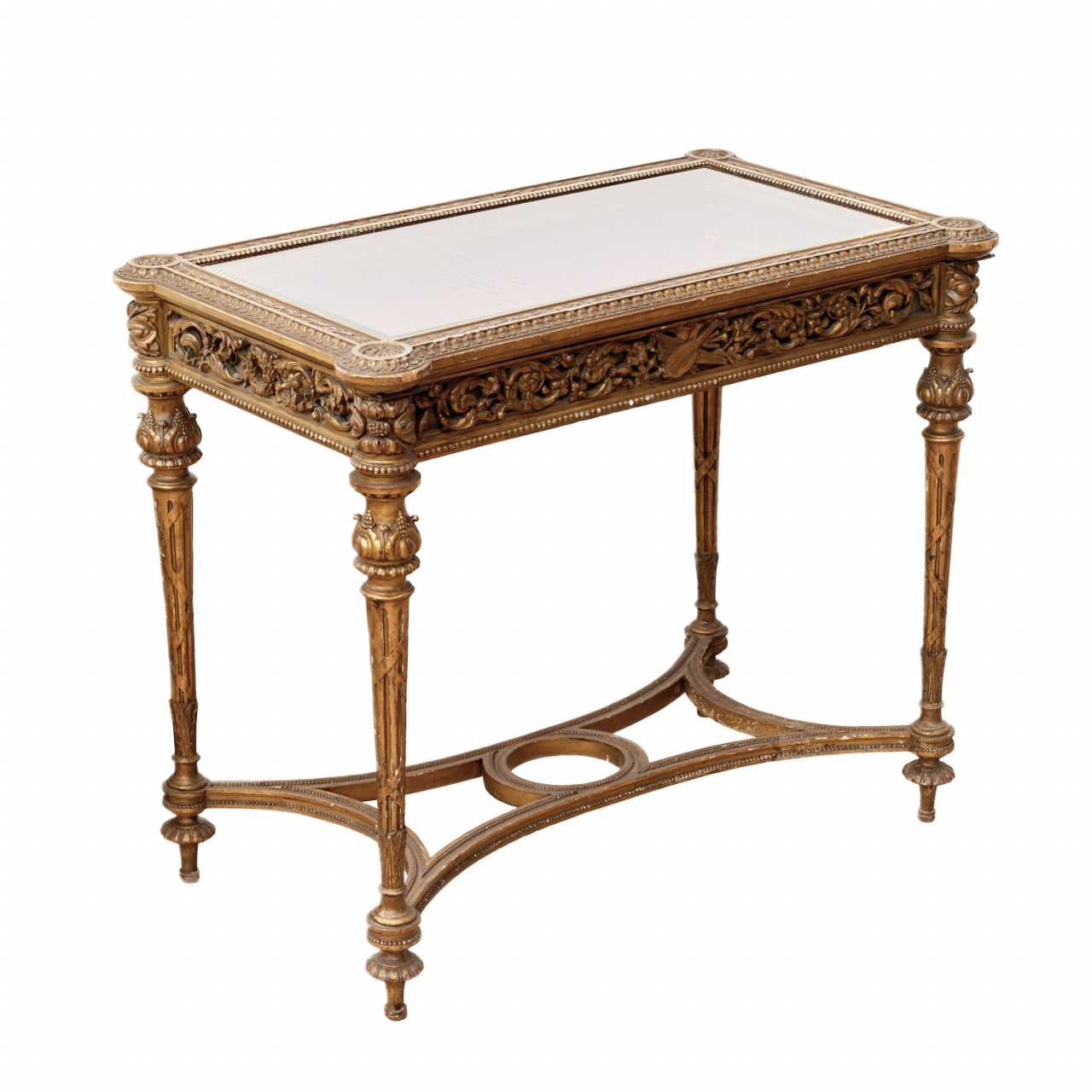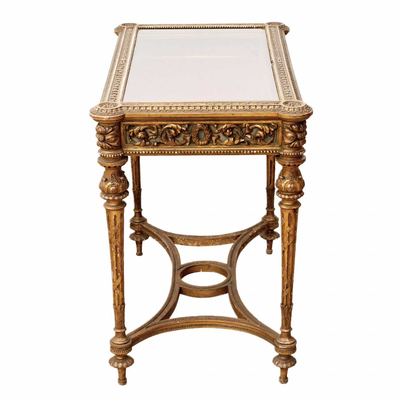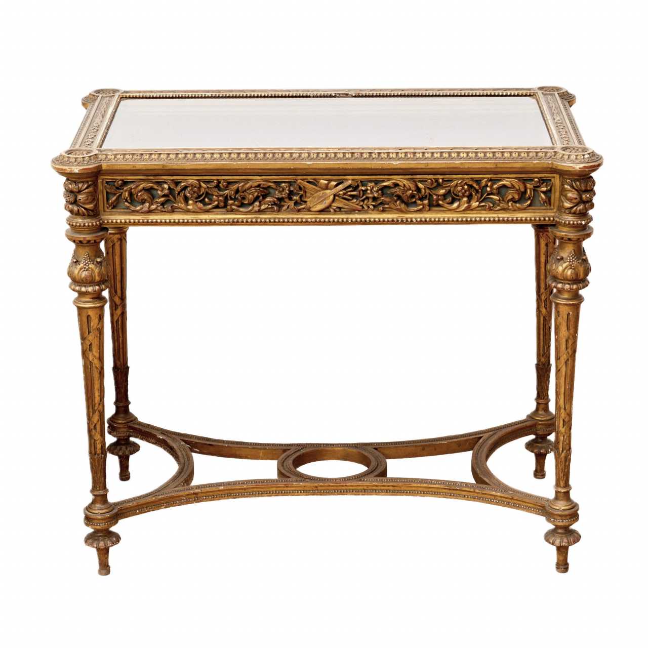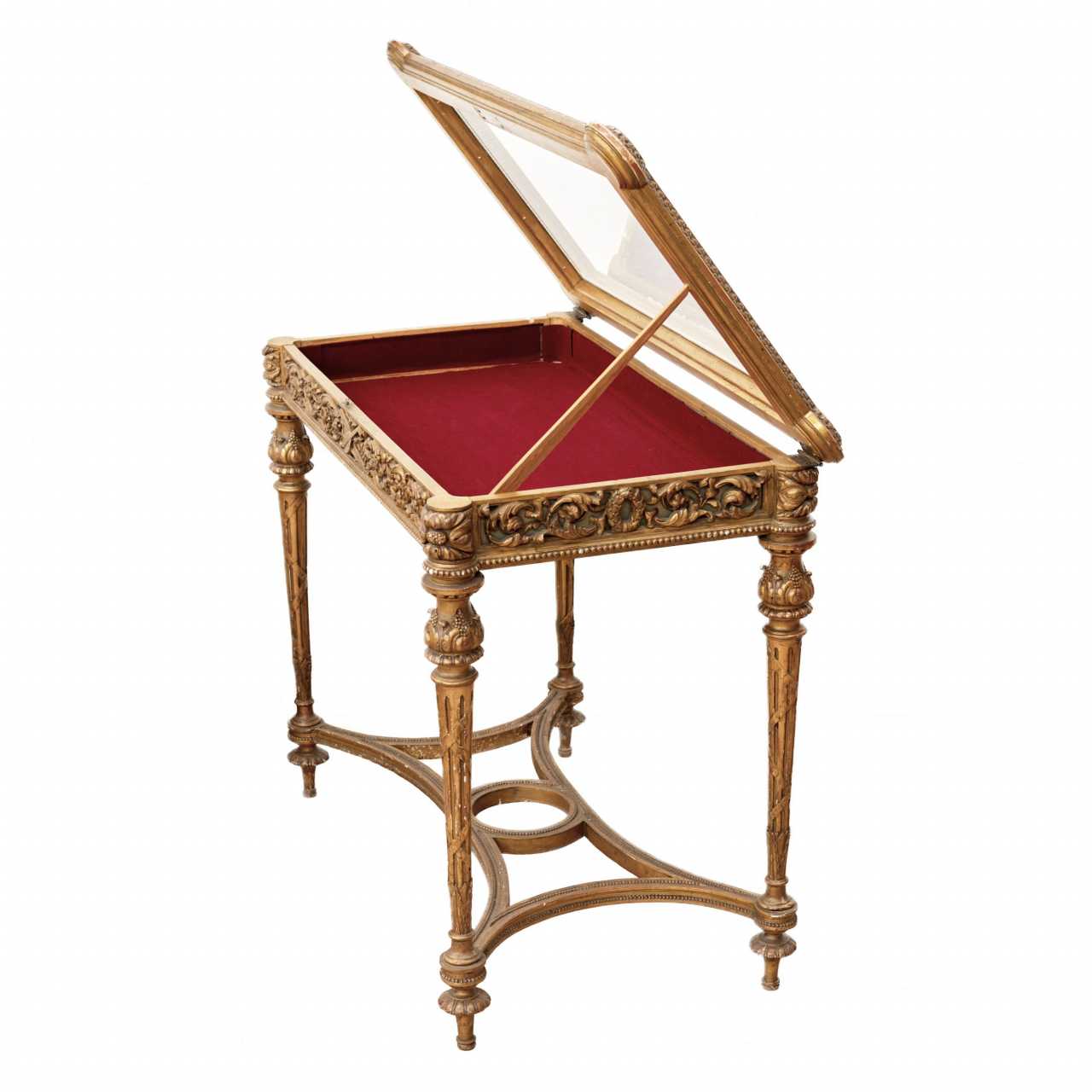 Table-vitrine sculptee en bois dore dans l`esprit Napoleon III fin XIXe siècle. Glas Late 19th century