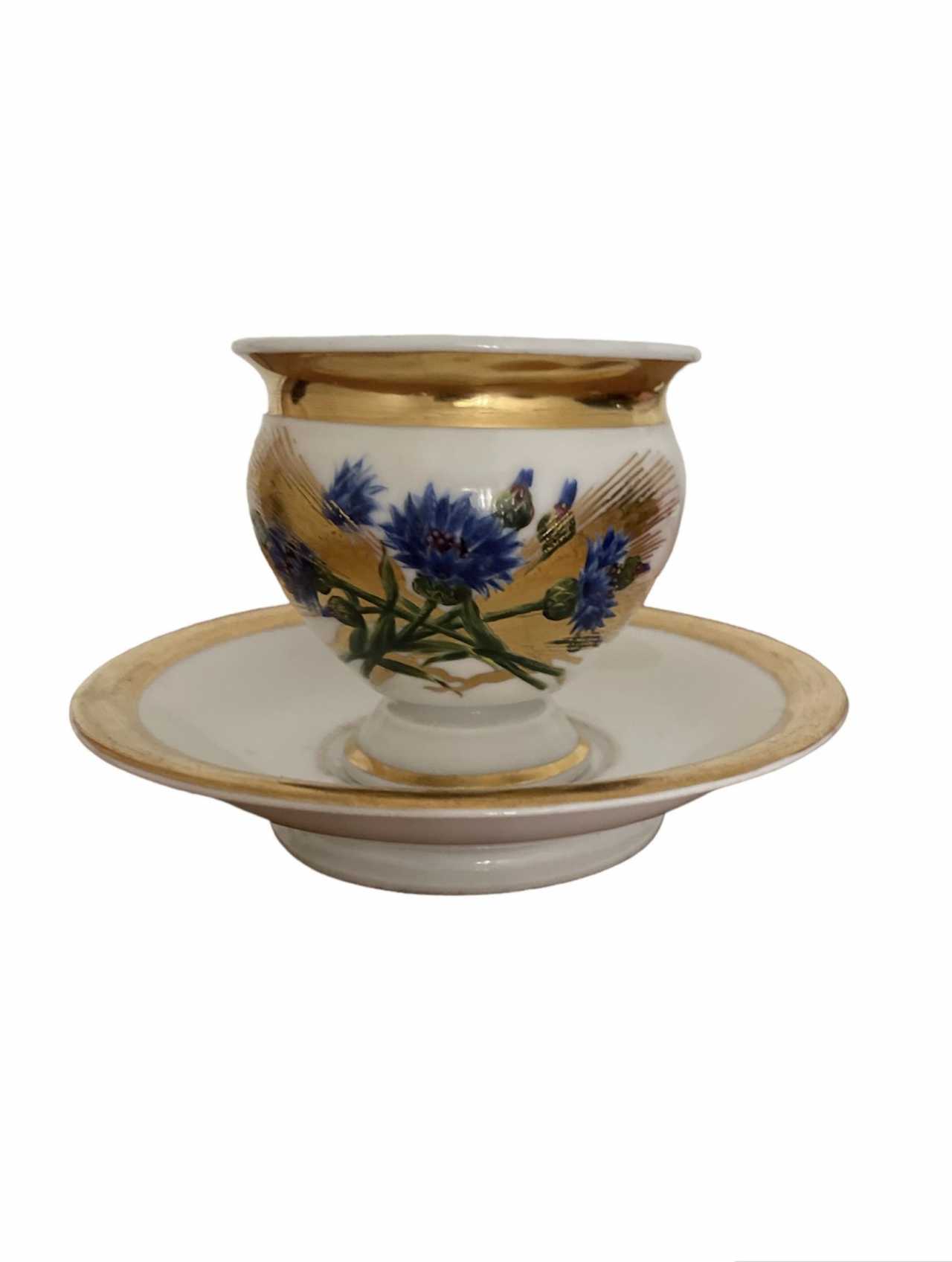 Tasse et soucoupe de style Empire Royal Copenhagen en porcelaine à décor floral et doré. Première moitié du XIXe siècle. sans aucune fissure ni dommage. Il n&39;a qu&39;un petit point noir dans la glaçure. Dimensions de la tasse : hauteur 7,2 cm et diamètre 7,5 cm. Dimensions de la soucoupe : hauteur 2,8 cm et diamètre 13,5 cm.