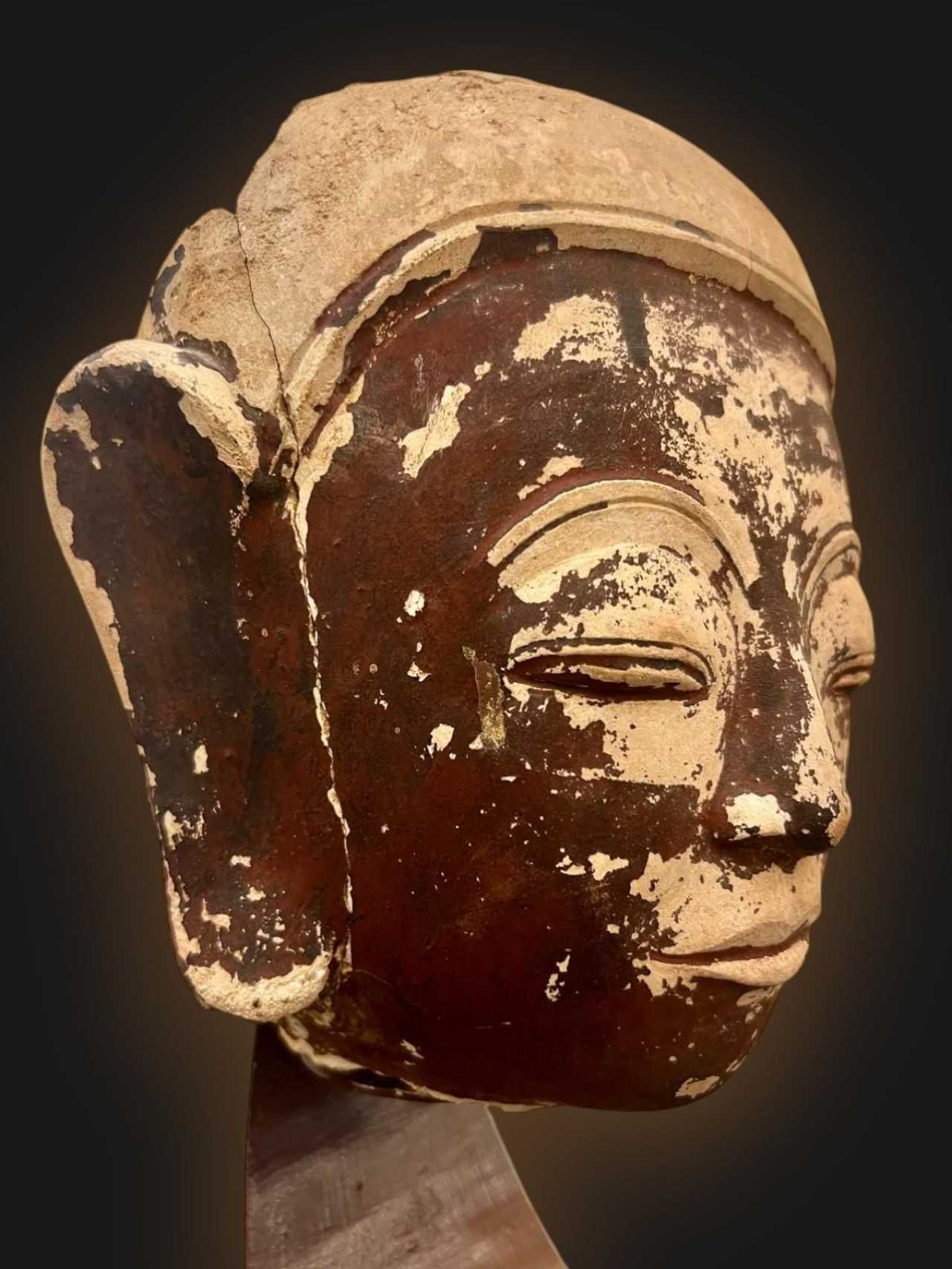 Stoneware Buddha head, Shan State Kingdom, Burma, 16th18th centuryBuddha head from a temple facing built entirely of mud bricks during the 16th18th century. Maravijaya Buddha. Shan period, Burma.The finesse of the master sculptors work is remarkable here: the large almond-shaped eyes with half-closed eyelids advocate introspection and humility, while the fine, well-defined mouth with pronounced corners preaches benevolence and universal love. His head is adorned with the Ushnisha, a cranial protuberance characteristic of Buddha and a symbol of his knowledge. This Buddha exudes emotion and wisdom, inviting the viewers eye and mind to meditative calm and enlightened concentration.This collectors piece stands out for its fine craftsmanship and its expression of wisdom, from which emanates great spirituality. Properly pedestal-mounted, this piece exudes serenity and soothing energy, and can easily be placed in your home on a shelf or in a bookcase.Height 36 cm on base.