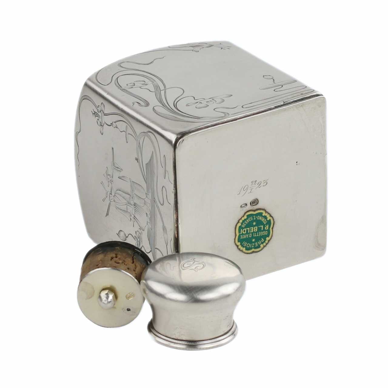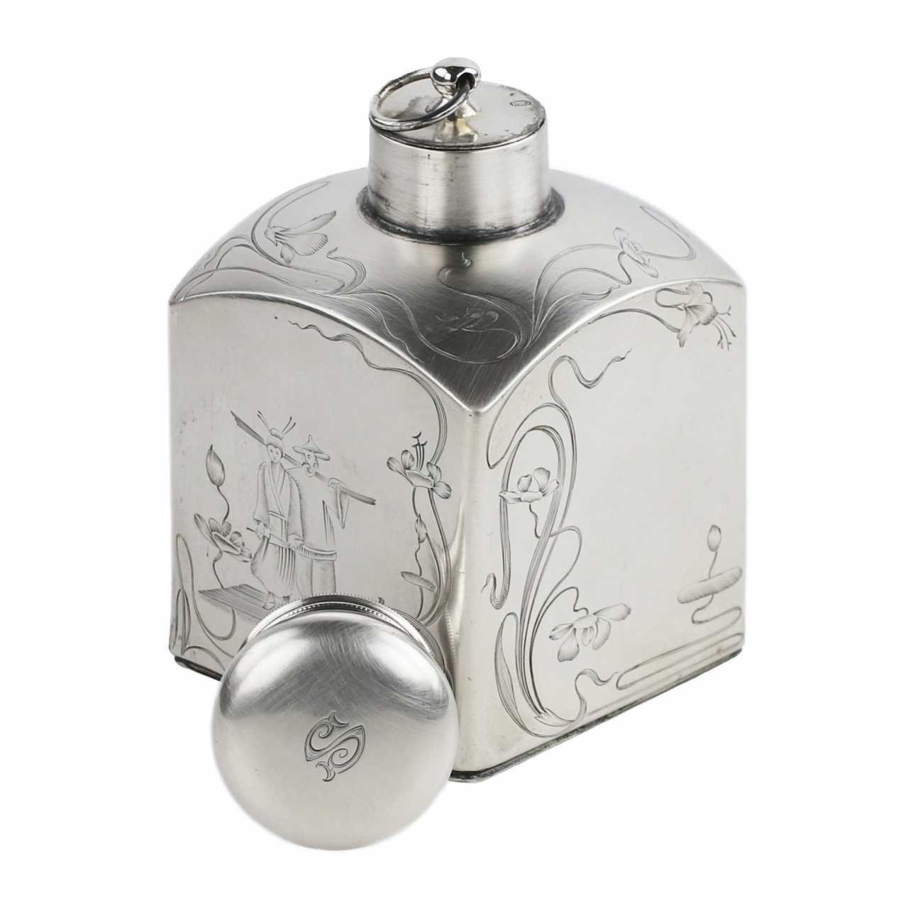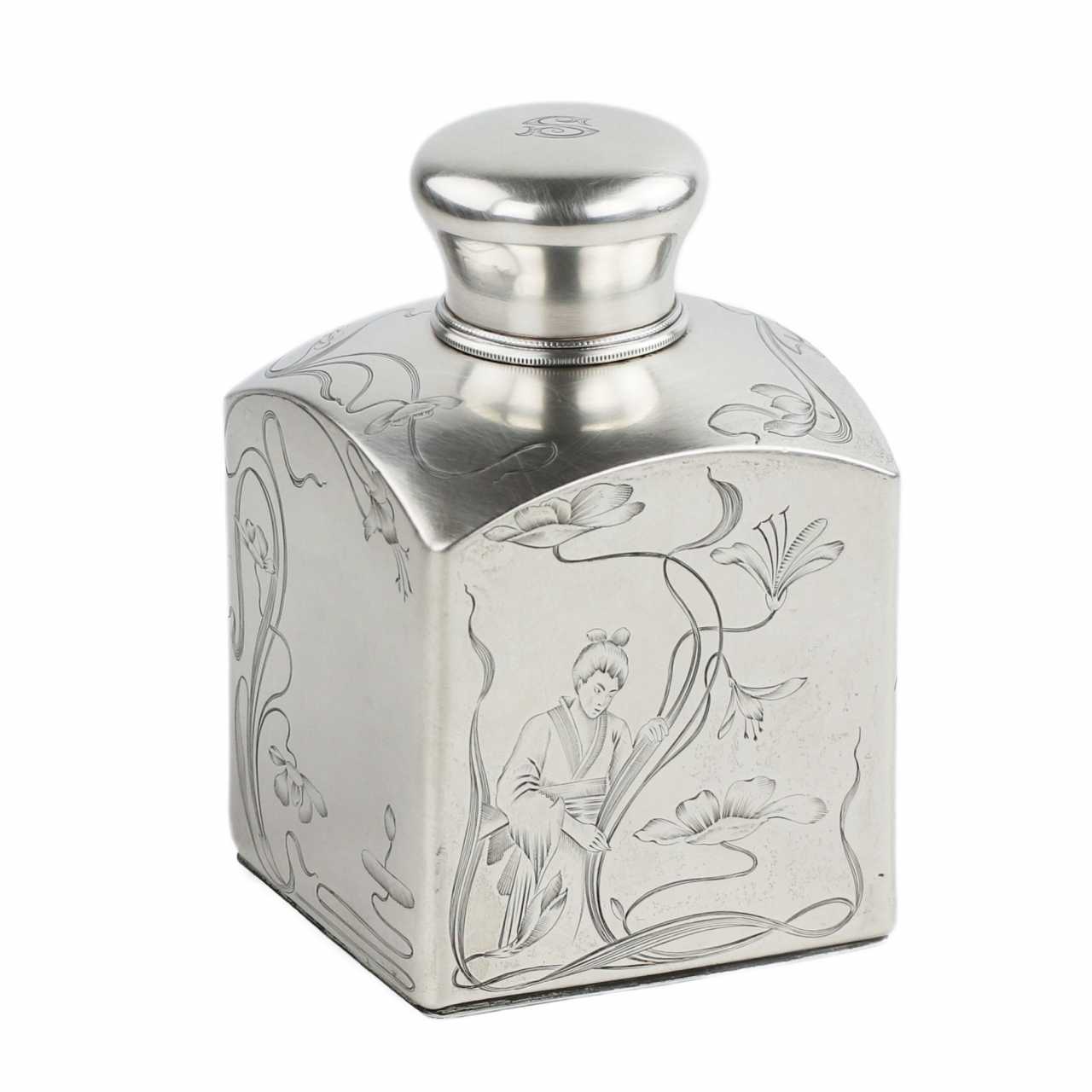 Élégante boîte à thé carrée en argent, fabriquée à Moscou entre 1896 et 1908. La surface du produit est décorée d`une gravure raffinée dans le style oriental, particulièrement populaire à l`époque de l`Art Nouveau. Le devant présente une silhouette féminine gracieuse en robe traditionnelle chinoise, entourée de motifs de fleurs de lotus et de lignes végétales fluides. Français La combinaison habile de l`artisanat de joaillerie russe et de l`influence orientale confère à la boîte à thé une apparence et une valeur artistique uniques. Poinçons : Le poinçon du maître avec les initiales MB (Belousov Maxim Vasilievich), réalisé en cyrillique, ainsi que le poinçon d`essai de Moscou de la période 1896-1908. Dimensions : Hauteur : 13 cm Largeur : 8 cm Poids : 336 grammes Informations historiques : Belousov Maxim Vasilievich est un célèbre maître joaillier moscovite, propriétaire d`un atelier d`argenterie, actif dans la période 1899-1908.