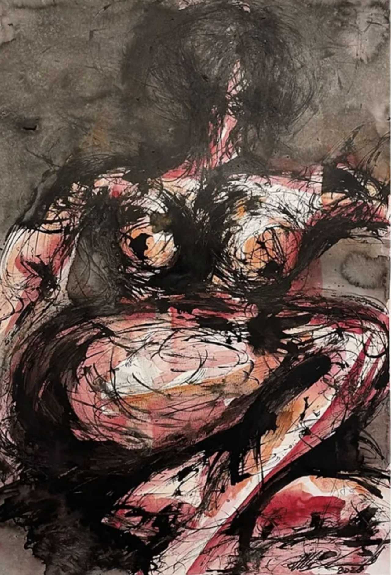 Ulla Martinmäki est une artiste amateur finlandaise dont le style de peinture est expérimental et parfois assez chaotique. Elle est fascinée par le caractère aléatoire et surprenant de peindre un corps humain. Elle pense que tous les corps sont si intrigants et beaux. Elle souhaite que tout le monde puisse regarder son propre corps avec gratitude, amour et fierté. 29 cm de large, 42 cm de haut, technique mixte sur papier.