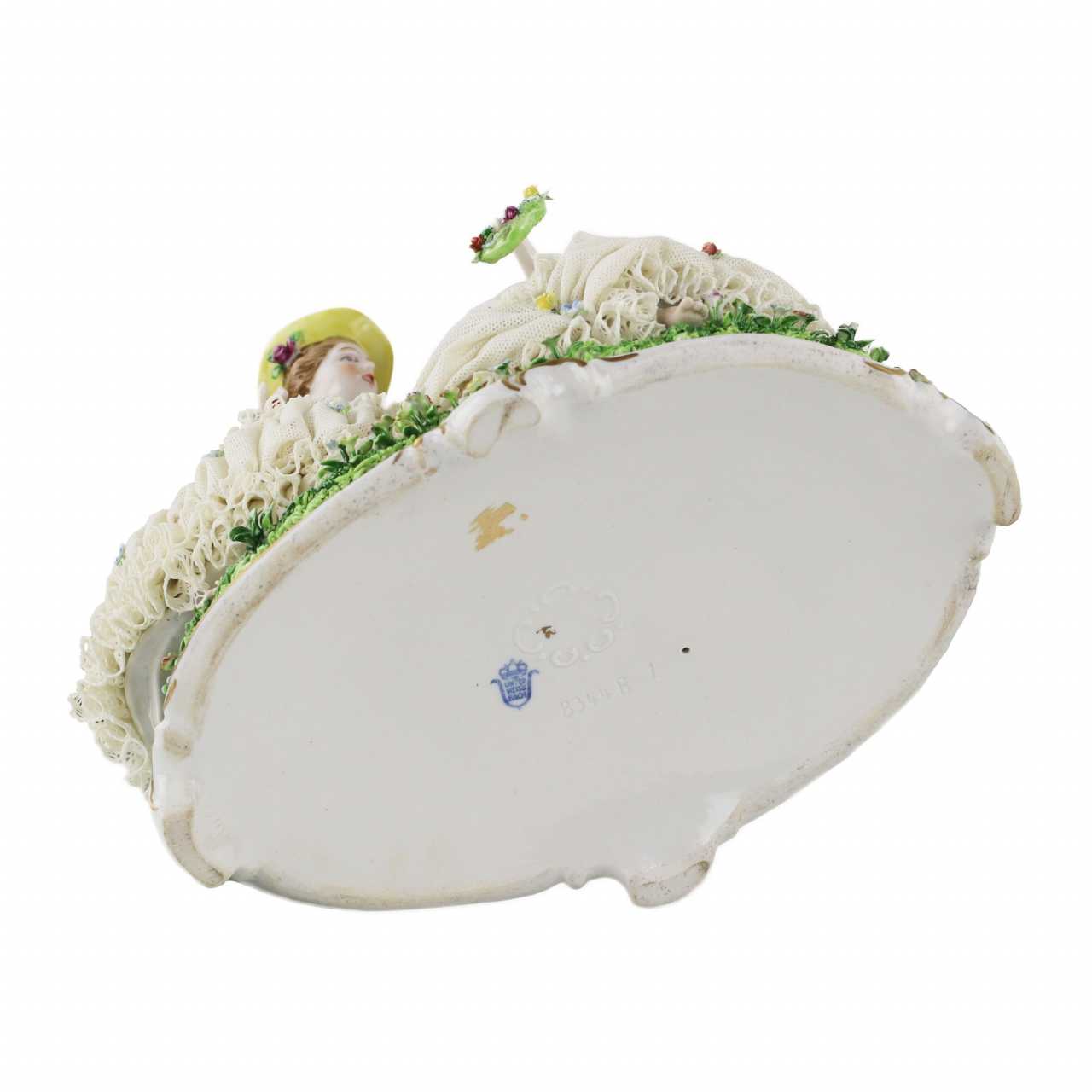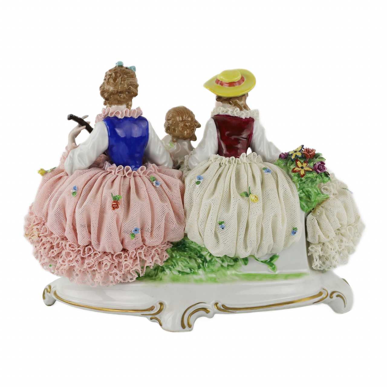 Unterweissbach. Joli groupe de porcelaine Concert sur l`herbe. Montre une composition pastorale de trois jeunes femmes assises dans une prairie fleurie, chantant et jouant de la musique sur une mandoline. Milieu du 20e siècle. Hauteur : 20 cm.