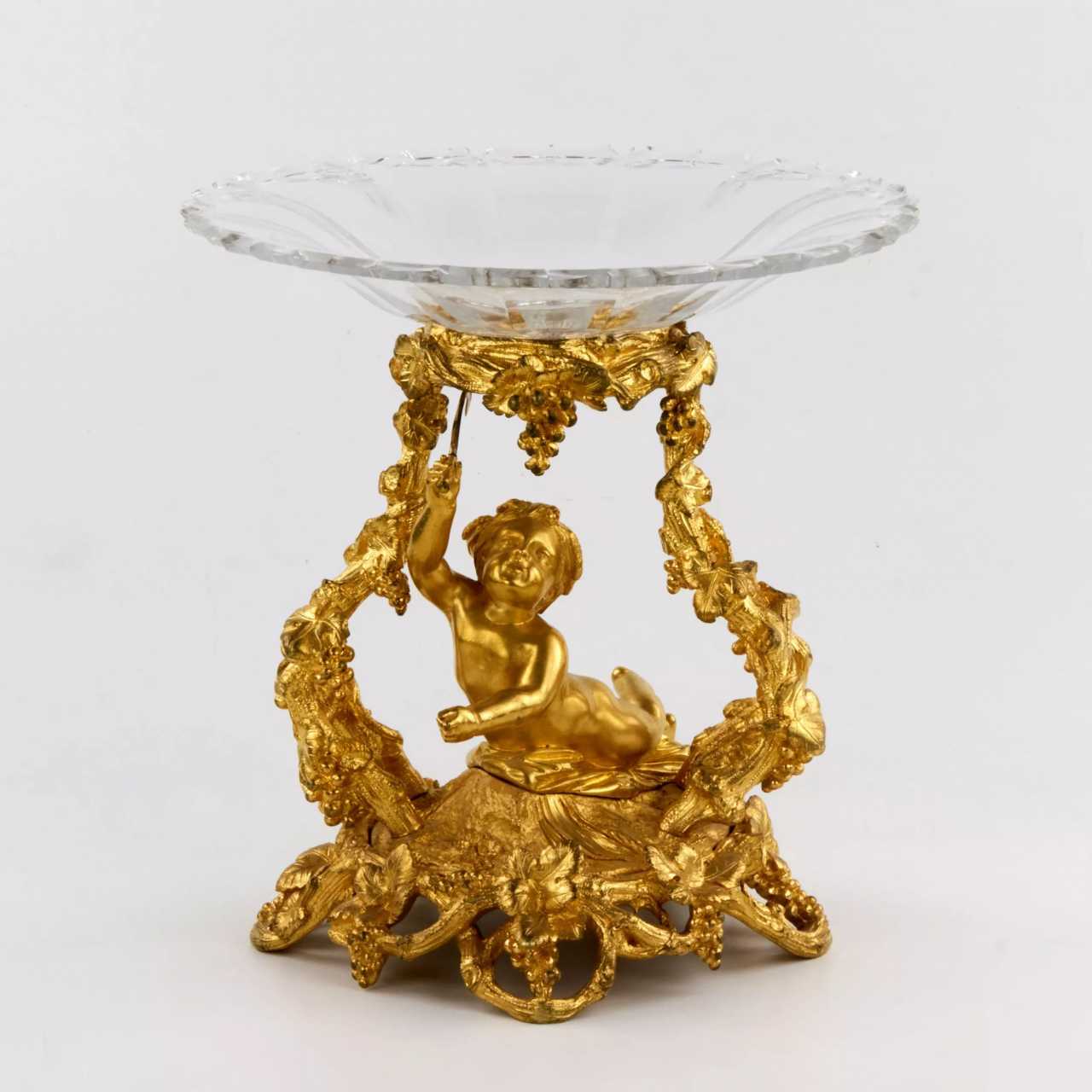 Vase à fruits decoratif, en bronze dore, avec cristal, dans le goût de Napoleon III. Represente l`abondance et est orne de la figure d`un putti - un vignoble avec une faucille recoltant la recolte.