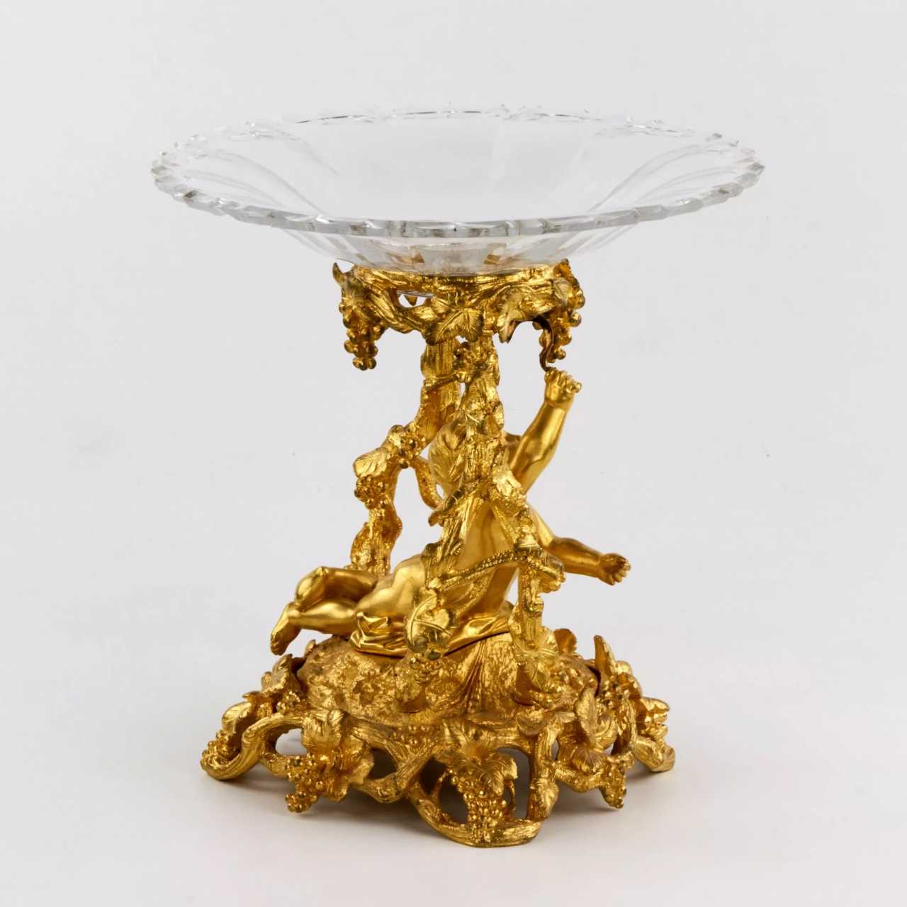 Vase à fruits decoratif, en bronze dore, avec cristal, dans le goût de Napoleon III. Represente l`abondance et est orne de la figure d`un putti - un vignoble avec une faucille recoltant la recolte.
