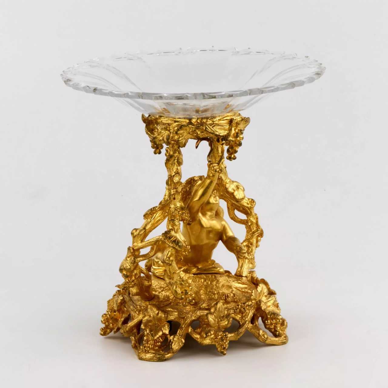 Vase à fruits decoratif, en bronze dore, avec cristal, dans le goût de Napoleon III. Represente l`abondance et est orne de la figure d`un putti - un vignoble avec une faucille recoltant la recolte.