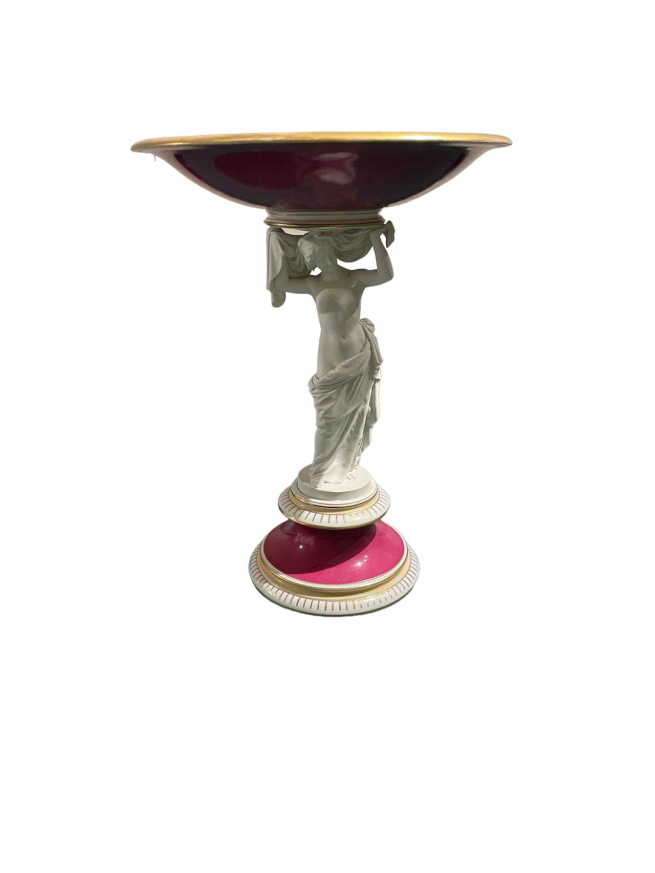 Présentant une pièce exquise de la célèbre porcelaine royale danoise Royal Copenhagen, cette compote incarne l&39;élégance du style Empire, datant du milieu du XIXe siècle (1850-1870). La compote supérieure présente une décoration complexe de peinture dorée, complétée par une figure de nu classique fabriquée à partir de porcelaine fine en biscuit. La pièce est marquée « Eneret. « Ce chef-d&39;œuvre est fabriqué à la main avec une attention méticuleuse aux détails, avec dorure, émail et peinture à la main. Cette compote Royal Copenhagen est non seulement une belle pièce décorative, mais aussi un artefact historique important de la prestigieuse manufacture royale danoise de porcelaine, réputée pour sa porcelaine de haute qualité et son excellence artistique. Conformément à son âge, présente des traces d&39;usure. Il y a un éclat sur le dessous du bord supérieur et une certaine usure sur la glaçure. Hauteur : 41 cm Diamètre : 31 cm