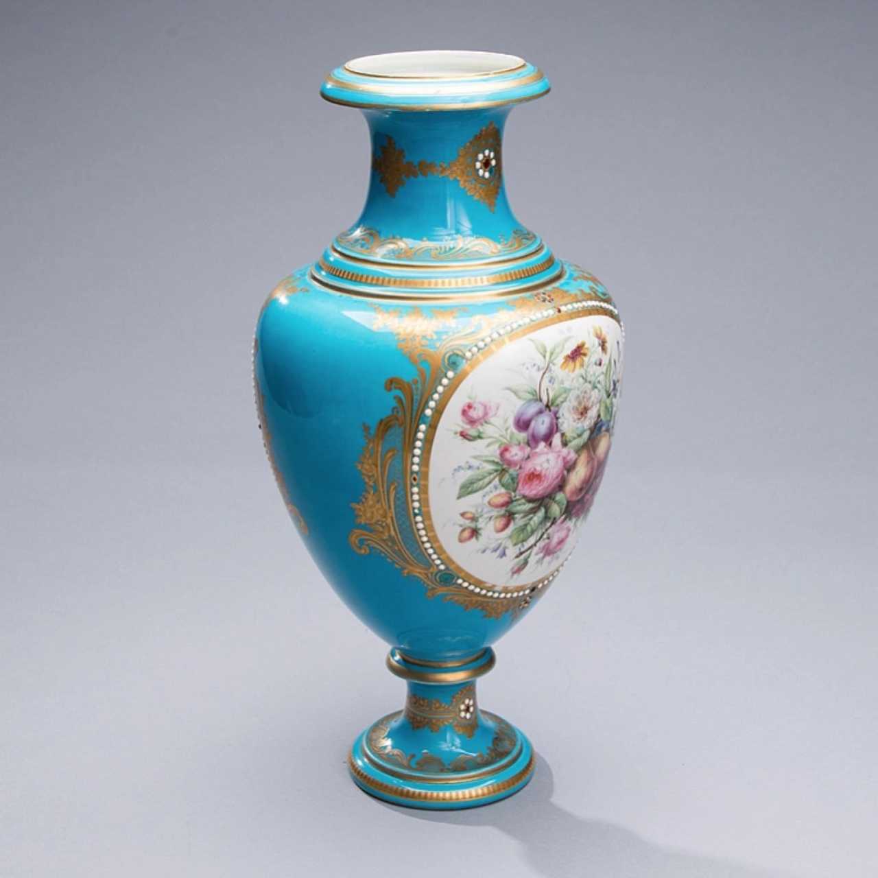Grand vase en porcelaine La Naissance de Venus. Avec la marque du fabricant Sèvre. Peinture recto-verso sur une amphore aux proportions renaissance de couleur bleue avec un ornement. Dans le medaillon de tête Naissance de Venus. Elle est dans levier avec un arc de tissu flottant rouge entoure damours et de nymphes musicales. Un vent frais accompagne son triomphe. Leau, la terre et les entrailles sont soumises à la deesse. Le paysage de lautre côte fait allusion à la future connexion de Venus et du Volcan, et la coquille est entraînee par des poissons et des oiseaux.Au dos, un magnifique bouquet de fleurs avec des poires et des prunes; attribut indispensable du triomphe de lamour et de labondance.