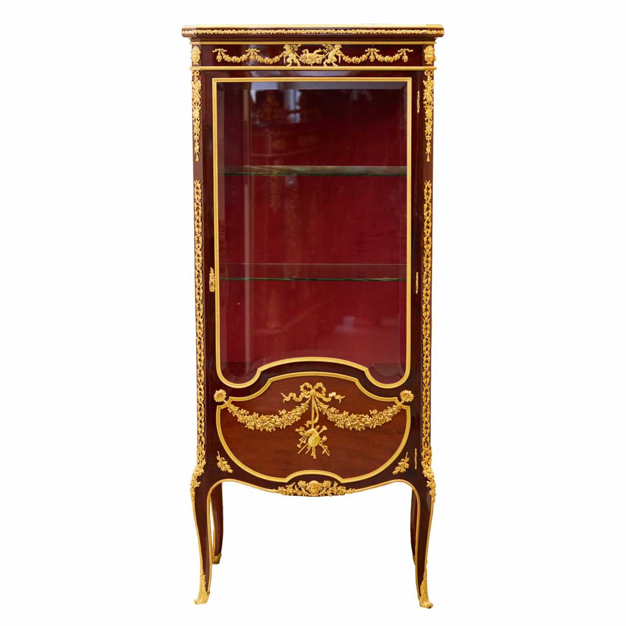 Une magnifique vitrine de style Sormani, aux proportions délicieusement fines et à la décoration gracieuse. Il sagit dune vitrine clé en main à un vantail en acajou sur pieds cambrés, à décor de bronze doré. Le rectangle allongé du corps aux coins biseautés est décoré de guirlandes ludiques dune frise de jeunes satyres portant leur compagnon de jeu, de grotesques musicaux et ligature de couronnes de laurier sur les plans des biseaux, dun panneau central avec des guirlandes florales luxuriantes, dun arc et de cornemuses. , et les jolis visages de mascarons dans les nœuds de la composition. On remarquera particulièrement le graphisme délicat et la finition des ceintures florales et des panneaux en filigrane de perles, soulignant lélégance des silhouettes des panneaux et lensemble harmonieux du produit.Verre biseauté sur trois faces, intérieur avec deux étagères en verre, dessus de marbre rose veiné. Dimensions : 149 x 64,5 x 38,5 cm France, fin du XIXème siècle.