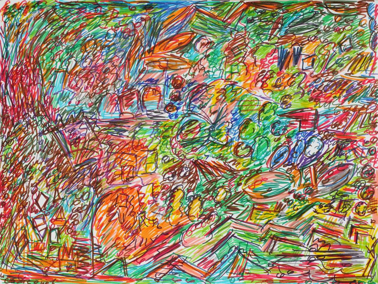 Работа исполнена в стиле Абстрактного экспрессионизма, на бумаге фломастерами.