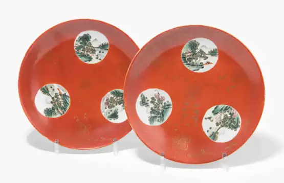 China, 19.Jh. Porzellan. Am Boden eine apokryphe Sechszeichen-Qianlong-Marke. In den kleinen runden Reserven polychrome Landschaften, hinterfangen von einem orangen Fond. D 23,5 cm.