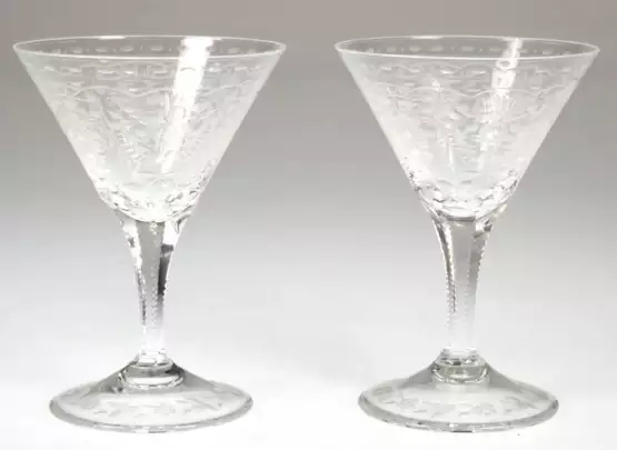 Los 629 | 2 Sektschalen, Moser Maharani, weit ausgestellte Kuppa mit floralem Tiefschliff, Stand mit Facettenschliff, H. 11 cm