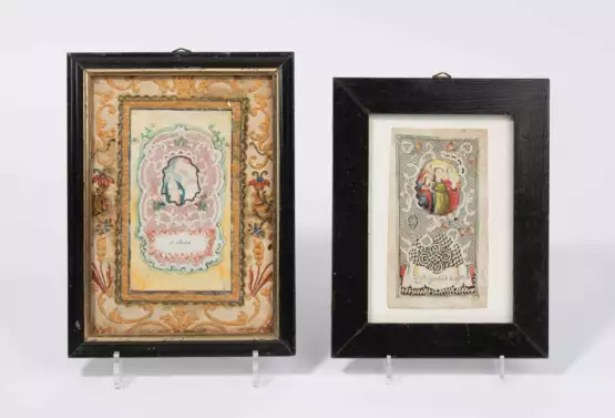 Süddeutsch, 18.Jh. Pergament geschnitten, gestichelt und genadelt, partiell gouachiert. Zentrale Gouacheminiaturen. Schutzengel mit Kind bzw. Hl. Anna mit Maria. Schriftband "S Angelus Custos" bzw. Schriftkartusche "S: Anna". Feiner Netzmaschenschnitt mit Spiralranken, Blumen und Rocaillen. 11x5,5 cm bzw. 10x6 cm. In Holzrähmchen. 19x15 cm bzw. 20,5x15,5 cm.