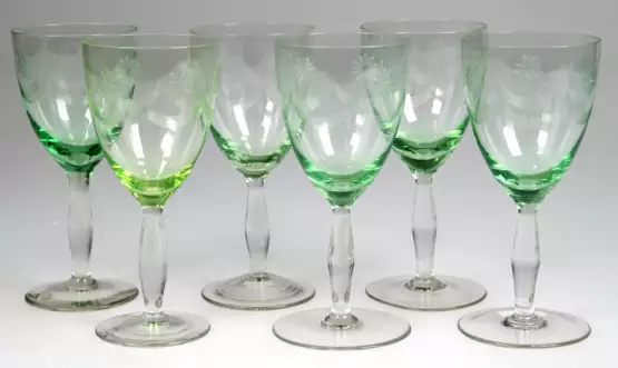 6 Jugendstil-Weingläser, um 1910, davon 5x Kuppa aus Uranglas mit Floraldekor, H. 15 cm