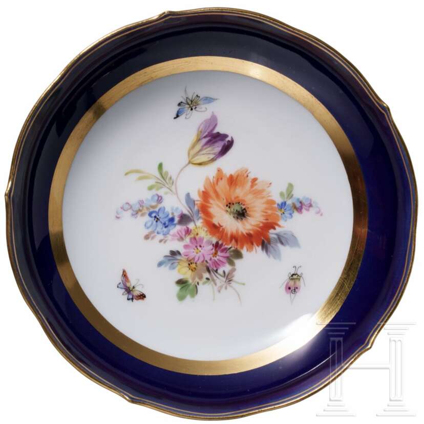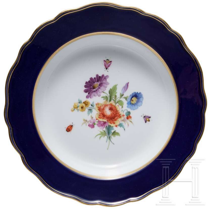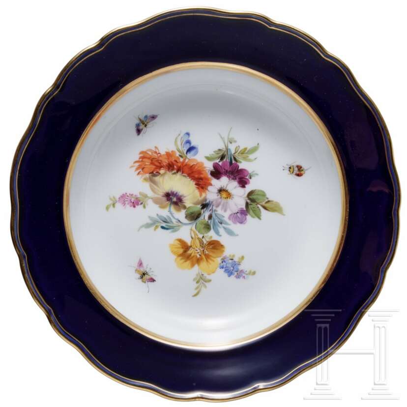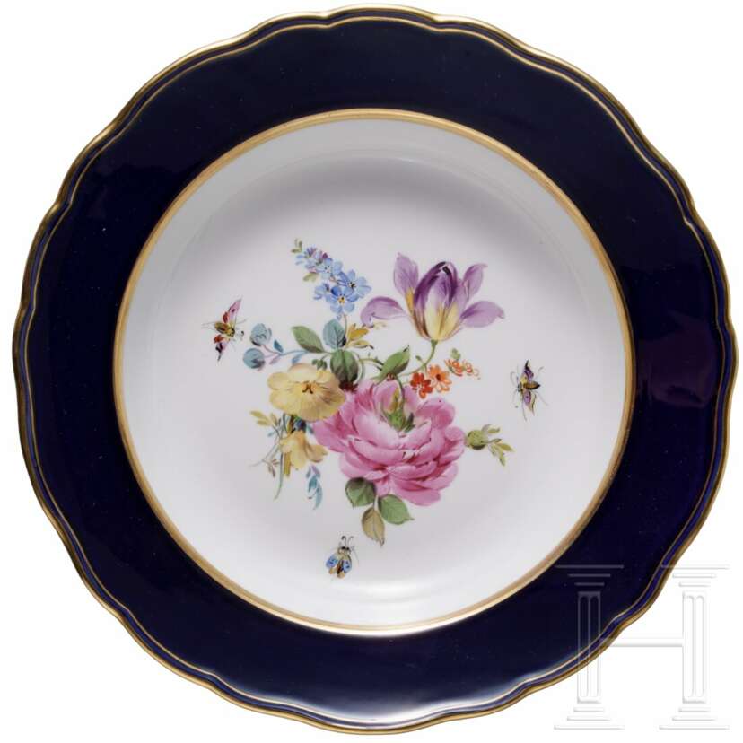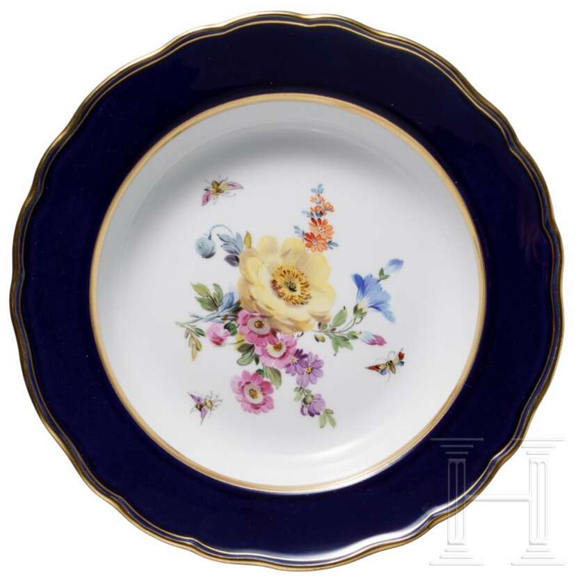 Porzellan. Bestehend aus sechs großen Tassen (Höhe 6,7 cm) mit drei Untertassen (Durchmesser 14,5 cm), 16 kleineren Tassen (Höhe 6,2 cm) mit 14 Untertassen (Durchmesser 13,7cm), 14 tiefen Teller, 15 Tellern (Durchmesser 25 cm), zwei Tellern (Durchmesser 22,7 cm), elf Dessertteller (Durchmesser 21 cm) und einer großen Servierplatte (Länge 51 cm). Alle Teile mit buntem Blumenbouquet und Insekten. Passig geschweifte Fahnen und Ränder in Kobaltblau. Unterseiten mit Knaufmarke, 1. Wahl. Eine Tasse mit Chip an der Mündung.