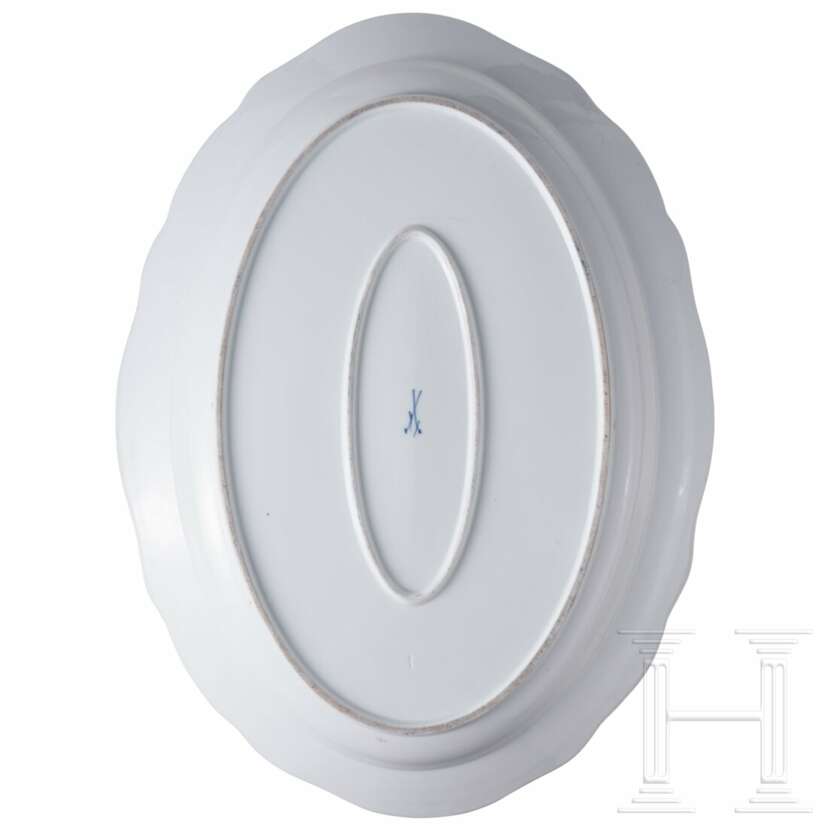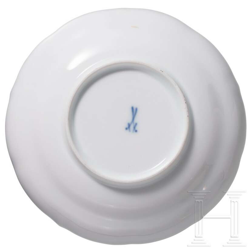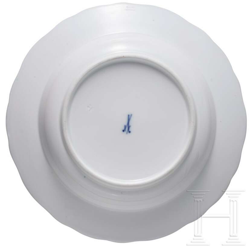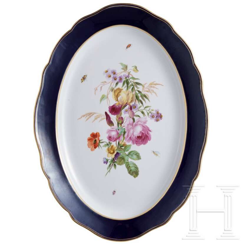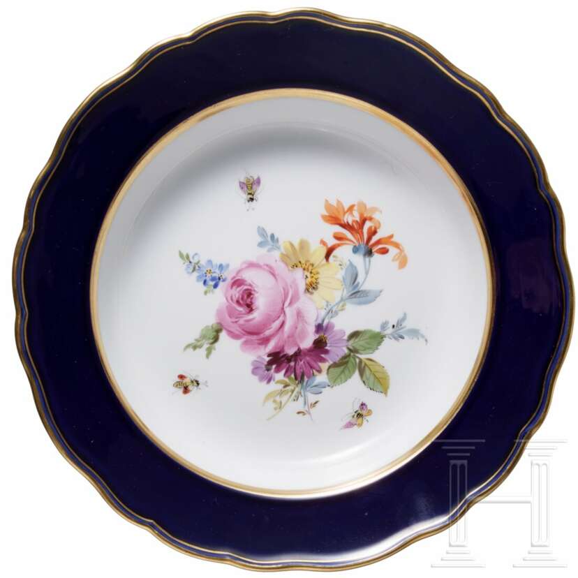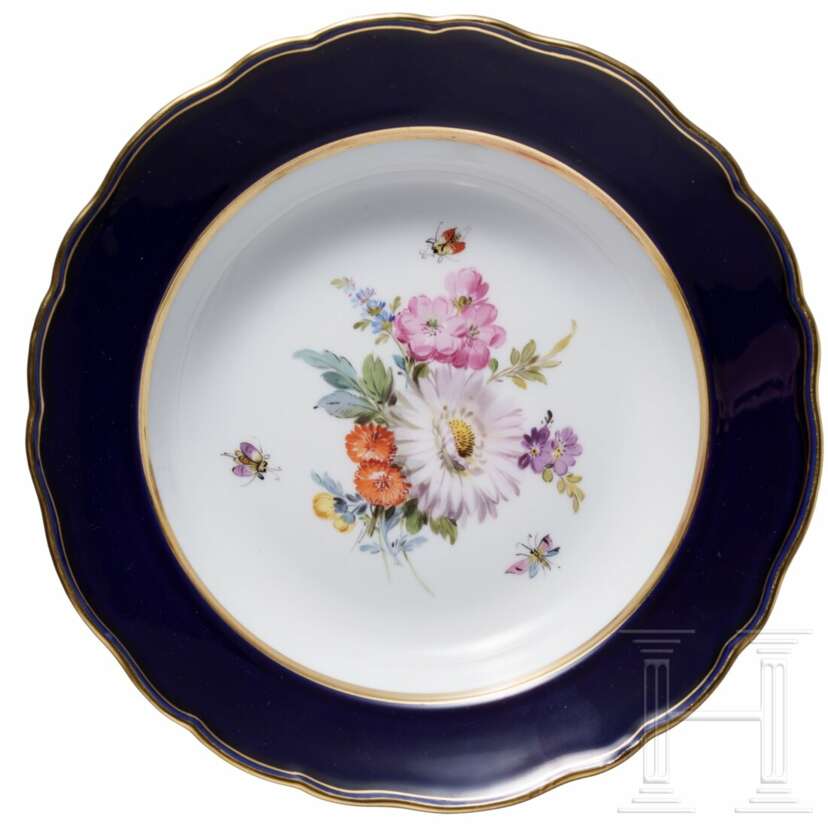 Porzellan. Bestehend aus sechs großen Tassen (Höhe 6,7 cm) mit drei Untertassen (Durchmesser 14,5 cm), 16 kleineren Tassen (Höhe 6,2 cm) mit 14 Untertassen (Durchmesser 13,7cm), 14 tiefen Teller, 15 Tellern (Durchmesser 25 cm), zwei Tellern (Durchmesser 22,7 cm), elf Dessertteller (Durchmesser 21 cm) und einer großen Servierplatte (Länge 51 cm). Alle Teile mit buntem Blumenbouquet und Insekten. Passig geschweifte Fahnen und Ränder in Kobaltblau. Unterseiten mit Knaufmarke, 1. Wahl. Eine Tasse mit Chip an der Mündung.