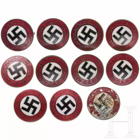 Elf Parteiabzeichen, davon zehn emaillierte Abzeichen und eine lackierte Ausführung, bei einem Abzeichen fehlt die Nadel. RZM-Hersteller: M1/165, M1/27, M1/120, M1/52, M1/170, M1/158, M1/8, M1/159, M1/72 (2x) und 1x "Ges.Gesch.". Alters- und Tragespuren.
