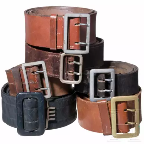 Wehrmacht und Partei: fünf Zweidorn-Koppel, Leder, teilweise gestempelt, anbei noch ein Ledergürtel, passend für einen "schweren" Ledermantel. Alters- und Tragespuren.