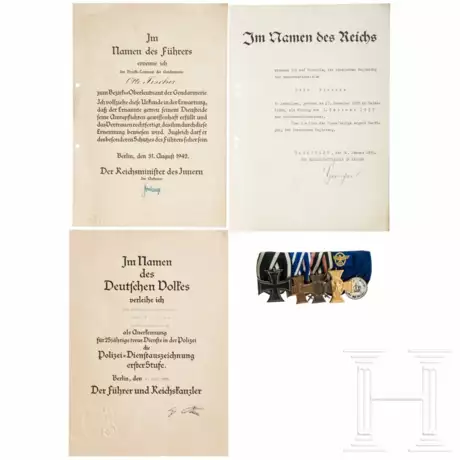 Große Ordensschnalle mit Eisernem Kreuz 2. Klasse 1914, Schaumburg-Lippe, Kreuz für Treue Dienste 1914, Frontkämpfer-Ehrenkreuz, Dienstauszeichnung der Polizei 1. Stufe für 25 Jahre und Preußen, Dienstauszeichnung 3. Klasse für 9 Jahre. Beförderung zum Gendarmeriemeister, 30.01.1935, OU des Reichsstatthalters in Hessen Jakob Sprenger. Doppelformat, zweifach gelocht. Beförderung zum Gendarmerie-Obermeister, 06.07.1939, Faksimile-Unterschrift Adolf Hitler, Doppelformat. Beförderung zum Bezirks-Leutnant der Gendarmerie, 31.08.1942, OU im Auftrag des Reichsministers des Innern, beschnitten und einmal gelocht. Alters- und Gebrauchsspuren.