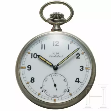 Nickelgehäuse, weißes Zifferblatt mit nachtleuchtenden arabischen Indizes und Zeigern, kleine Sekunde auf der "6", bez. "KM - Cortébert". Köring vergoldetes Werk im Handaufzugskaliber 526. Das Glas bestoßen. Durchmesser ohne Krone ca. 50 mm. Funktionsfähig. In späterer hölzerner Aufbewahrungsschachtel.